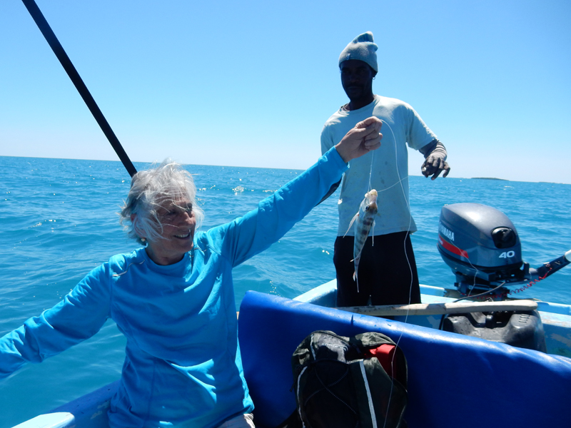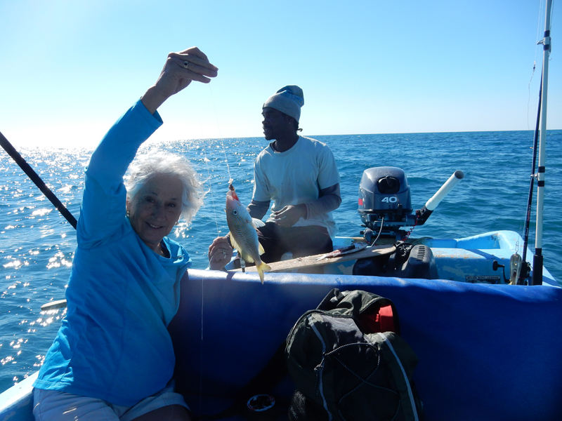 Helen’s second fish, fishing technique – line with a spark plug on the end for weight and a single hook about 6 inches up from the bottom with bait on it. Get weight on bottom, feel for pull and jerk up. It worked! Helen caught eight fish and I caught five
