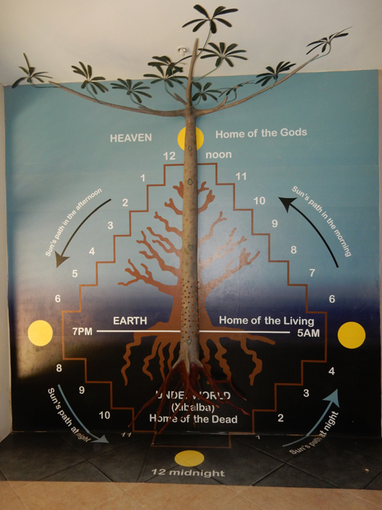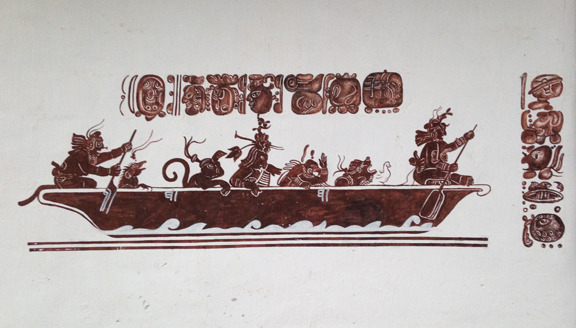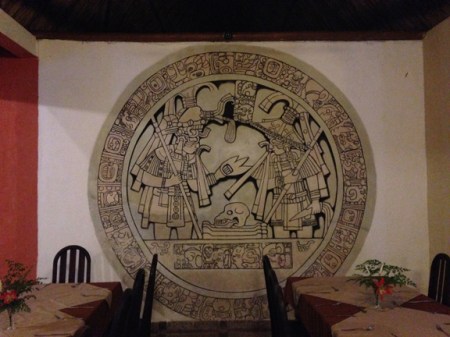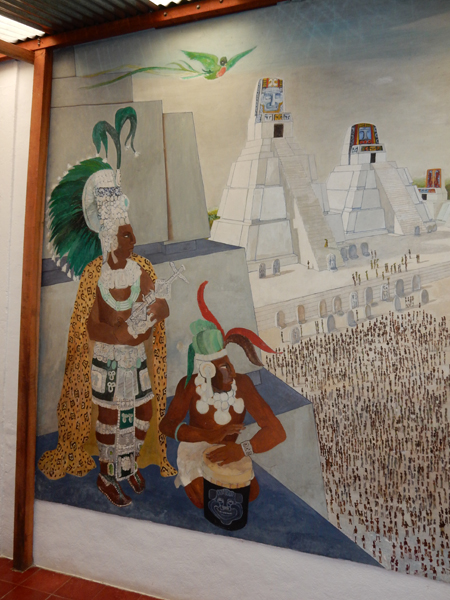 Anyway, we ended at the Gran Plaza and climbed back up to the viewing platform on Temple I for the sunset. Unfortunately, it was a cloudy evening. To be honest, this guide was not very good. Eighty-five percent of what he covered, I already knew from my readings and guidebook. I’m sure others are better but if I were to do it again I would not hire a guide. We were “pooped” by the time we got back at 6:30 for dinner. We walked and climbed pyramids for 9.5 hours today. Here is some Mayan art from the Tikal Inn.