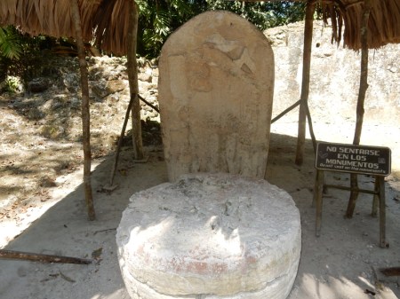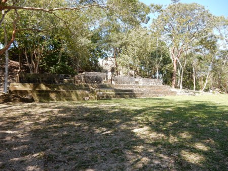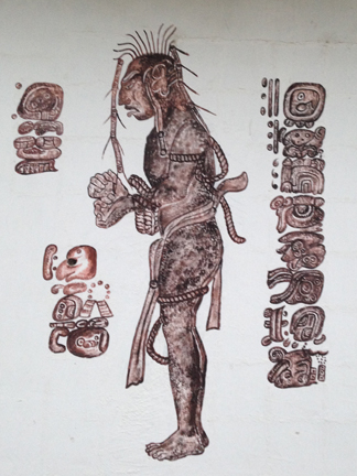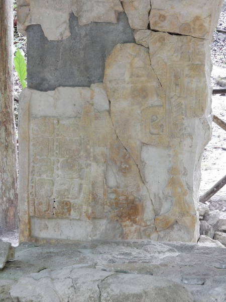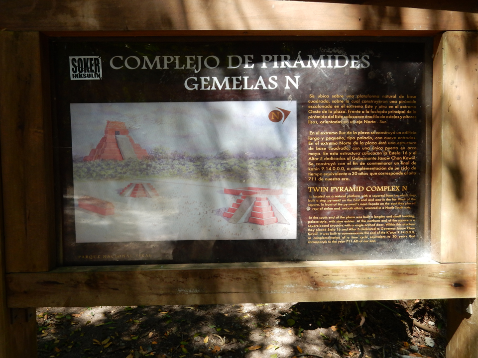 Complejo de Piramides Gemelas N – this complex is thought to have been constructed by King Moon Double Comb to mark the end of the 14th katun of Baktun 9. That is, 144,000 days or about 394 years. You may recall that some were predicting the end of the world on 12/21/2012, the end of the last katun. The king is portrayed on this stelae (stone shaft).