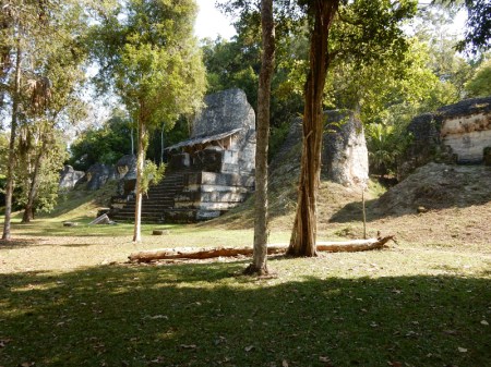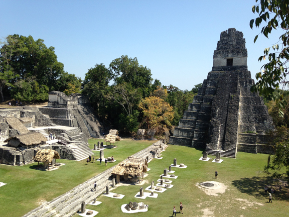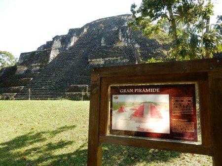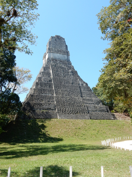 View of Temple I from south side of Gran Plaza. Lord Chocolate (King Moon Double Comb) was buried here along with 16-lbs of jewelry, 180 jade objects and 90 bits of bone carved with hieroglyphs.