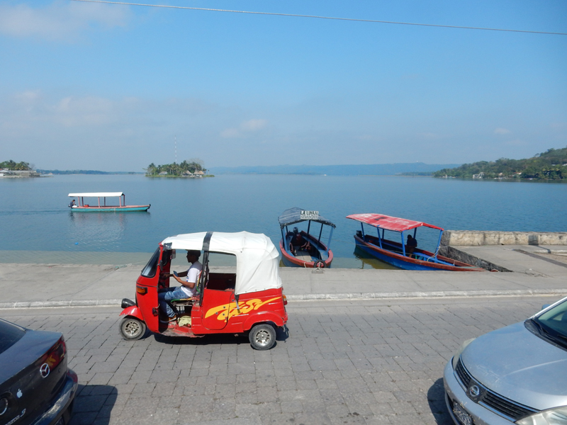 It took about an hour to drive to Flores Guatemala, a small (3,000) island in Lago de Peten Itza. Here is a picture of a taxi (Tuk Tuk) and boats you can hire to tour the lake.