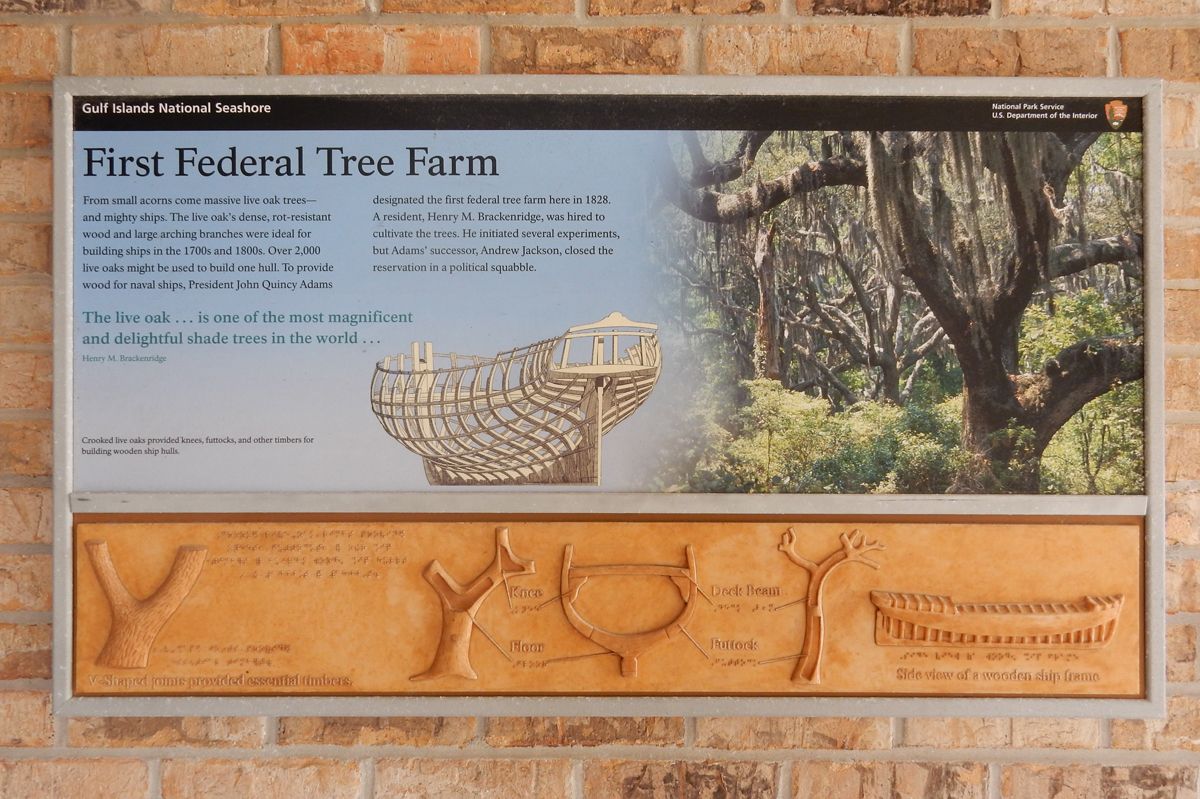This area was the first tree farm in the U.S. (1828). About 1000 live oaks were used to build one wooden vessel. It is called a “live oak” because it both drops and keeps leaves year-round. The limbs and trunks were used to provide specific shapes for various parts of the boat. President John Adams considered the Navy the first line of defense from foreign invasion. The U.S.S. Constitution (Old Ironsides) gained fame when cannon balls bounced off its live oak walls. It is still a Navy ship. When it is in port in Boston, it is part of the Boston Freedom Trail and can be toured free of charge.