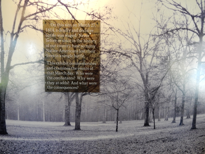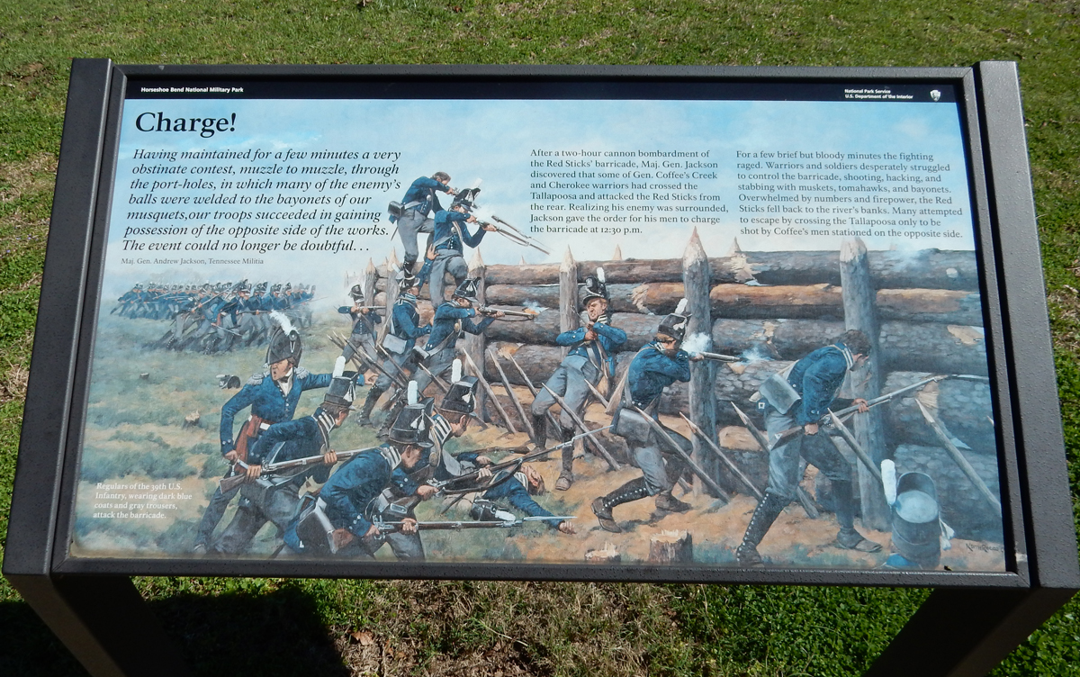 In the late 1700’s the Creek Nation had a loose confederacy with those living NW of the Chattahoochee River considered the Upper Creeks and those SE of the river the Lower Creeks. The confederacy signed a treaty with the U.S. in 1790 defining land boundaries. As more white settlers moved into the area the Lower Creeks were said to become “more civilized” as they had closer contact with their GA neighbors. However, the Upper Creeks in AL had regular conflicts with white squatters and became “nationalistic.” At the same time, the Shawnee Chief Tecumseh was trying to unite Indian nations to drive the “white man” from Indian lands. Many of the Upper Creeks agreed with this approach and became known as “Red Sticks,” because they painted their war clubs red. After a series of battles the Red Sticks set up a fortified defensive position on a 180-degree bend in the Tallapoosa River.