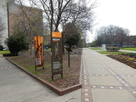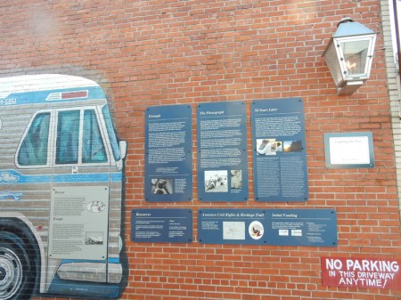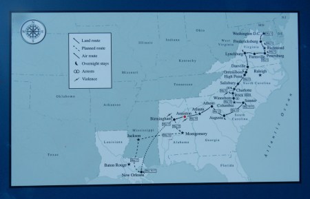 March 16 – the electricity was out at the Lodge when we exited at 7am. We packed up, brushed teeth, etc. with our head lamps and then drove down Cheaha Mountain. Got gas and a carry out breakfast and arrived at the new Freedom Riders National Monument site in Anniston AL at eight. President Obama declared it a National Monument on January 12, 2017 along with Birmingham Civil Rights NM and Reconstruction Era NM in Beaufort SC – all honoring the American Civil Rights Movement.