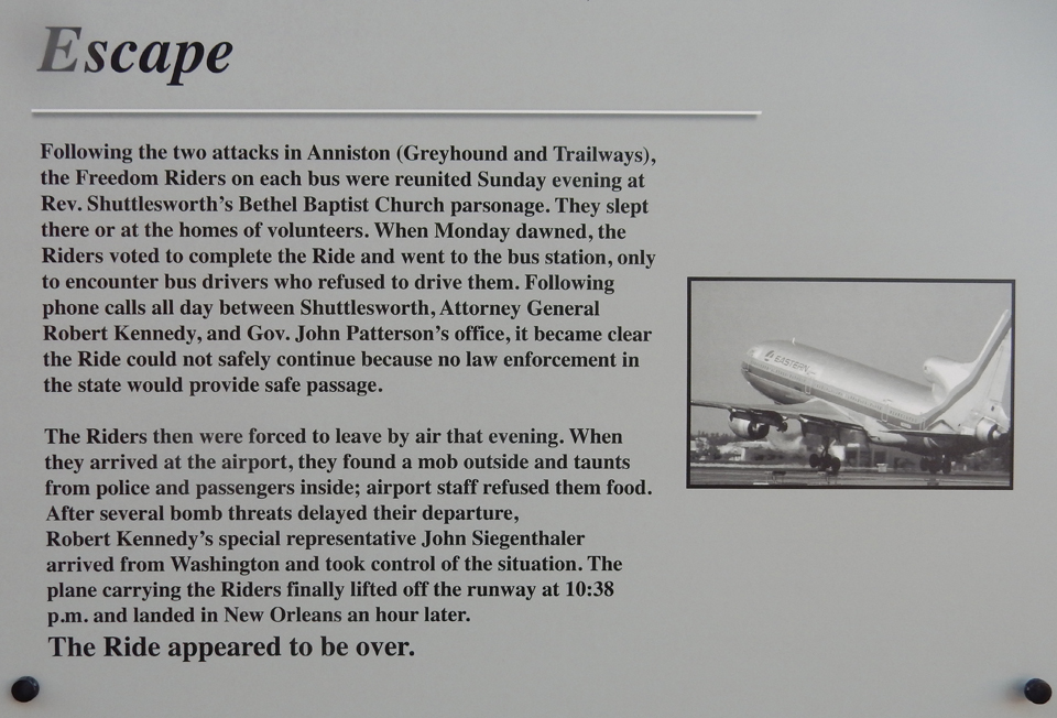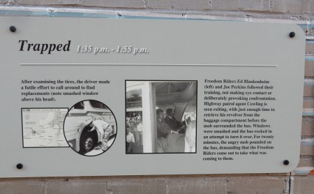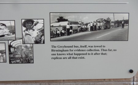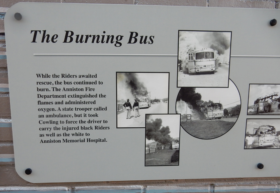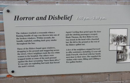 The monument tells the tale of black and white (integrated) civil rights advocates who, on May 4, 1961, boarded a Greyhound bus in Washington D.C. with the objective of riding it through states that had segregation laws to New Orleans. They were called the “Freedom Riders.” They were testing the 1960 Supreme Court ruling that prohibited segregation in depot restaurants and restrooms serving the interstate system. Read On – to learn more about what happened when the bus reached Anniston AL on May 14th.