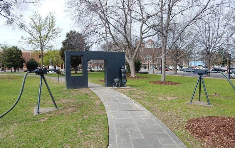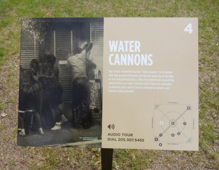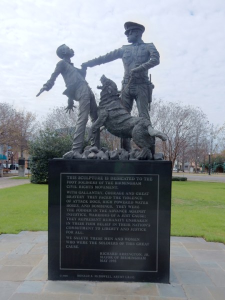 Caty corner from the church is Kelly Ingram Park. Peaceful protesters were brutally attacked here by police with their batons, dogs and water cannon.