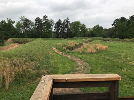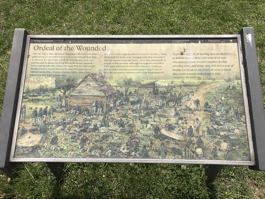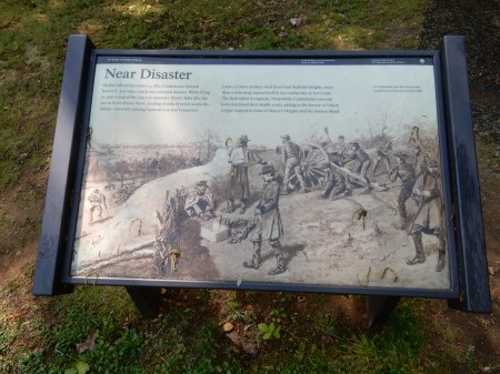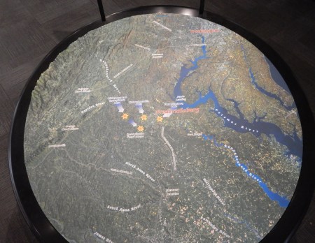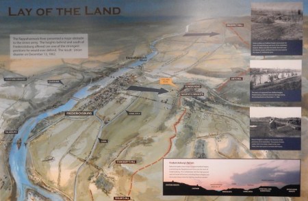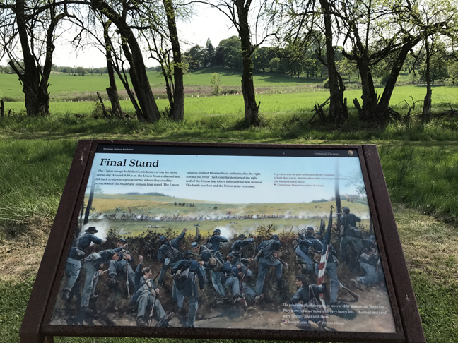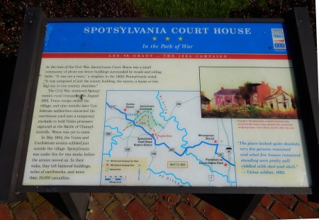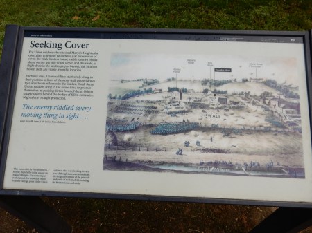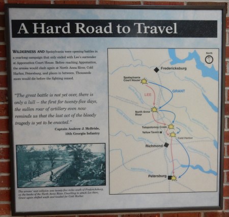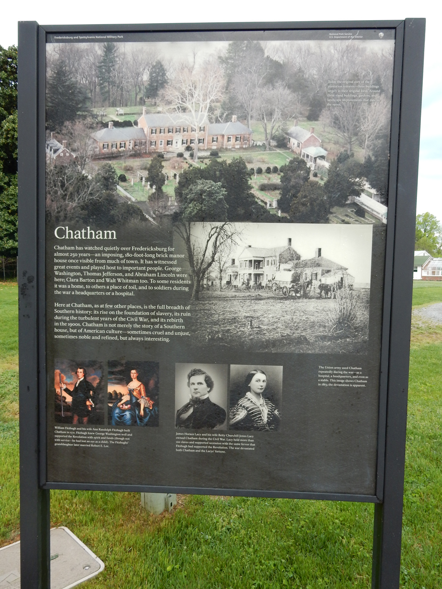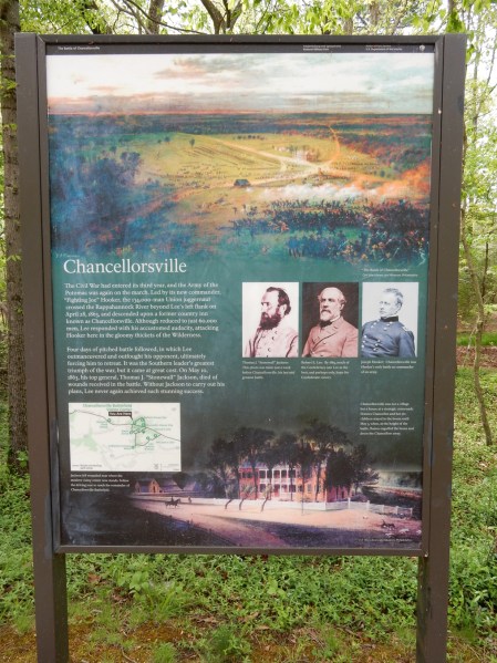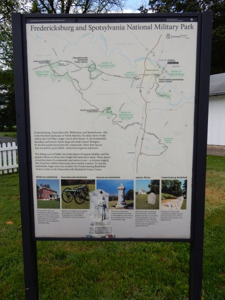 April 21st – I started driving at 4am and stopped for gas and personal hygiene before going to a 24hr McD’s, found enough money on the ground by the take-out window to pay for my senior coffee! I spent 2.5 hrs there writing my notes and eating the Graham Crackers and an orange I had brought with me. It was a short drive to the Chatham House that was finished in 1771 and was the center of a plantation that included 1,228 acres. It is now part of the Fredericksburg and Spotsylvania County Battlefields Memorial National Military Park VA. Phew, that’s some name for this National Park Unit and still it doesn’t indicate the extent of the, primarily, Civil War history that it encompasses. I covered 70 miles today; 32 stops including two Visitor Centers, 2 Battlefield Exhibit Stations and 4 historic buildings. I did the tour, as recommended (chronologically), from the Battle of Fredericksburg December 11-13, 1862, to the Battle of Chancellorsville April 27 to May 6, 1863, to the Battle of the Wilderness May 5-6, 1864, to the Battle of Spotsylvania Court House May 8-21, 1864. Keep in mind that there were many “lesser” battles in this same region during this 1.5-year period. In addition, there were many other battles, big and small, in other regions during this same time-period.