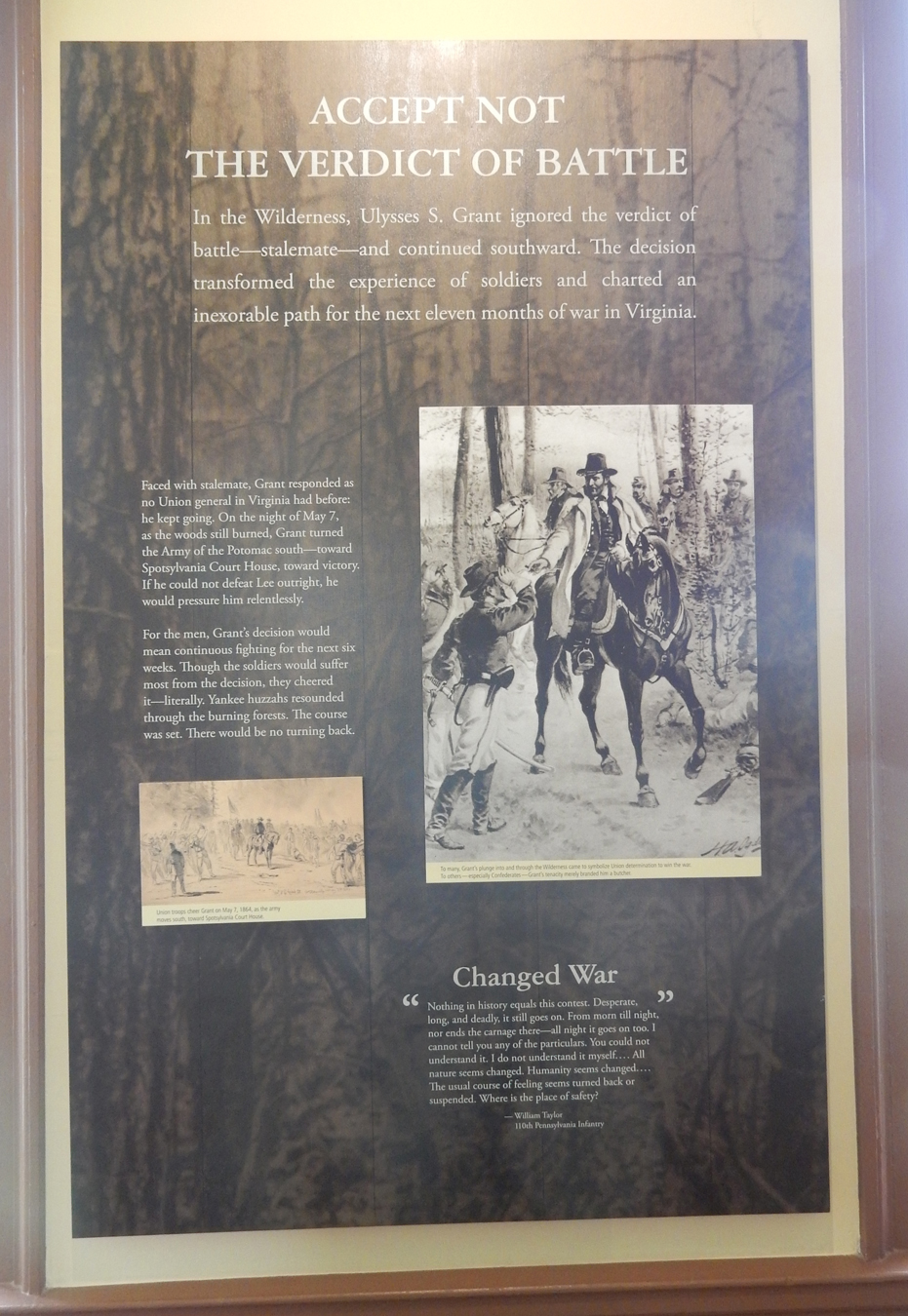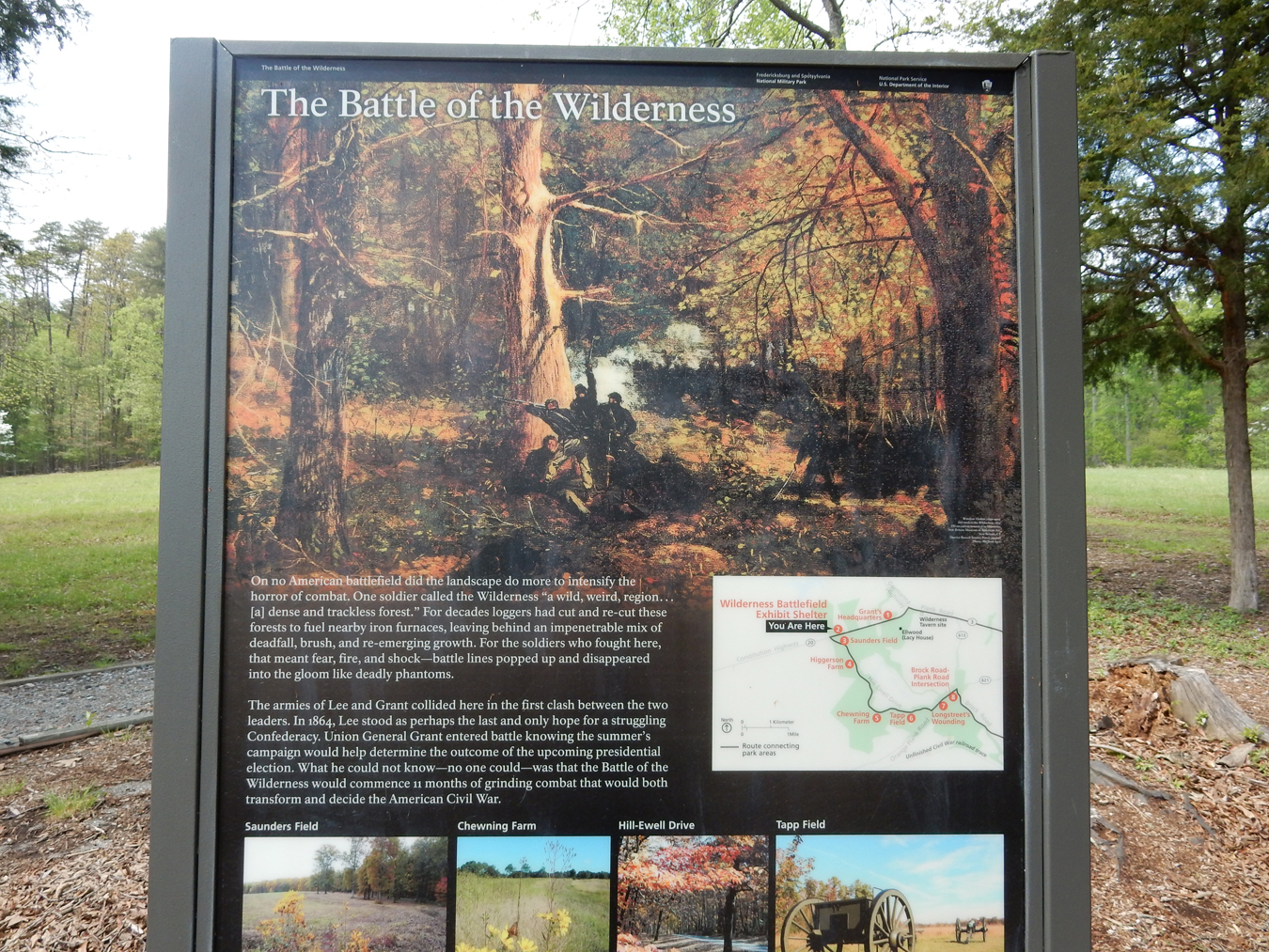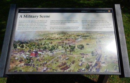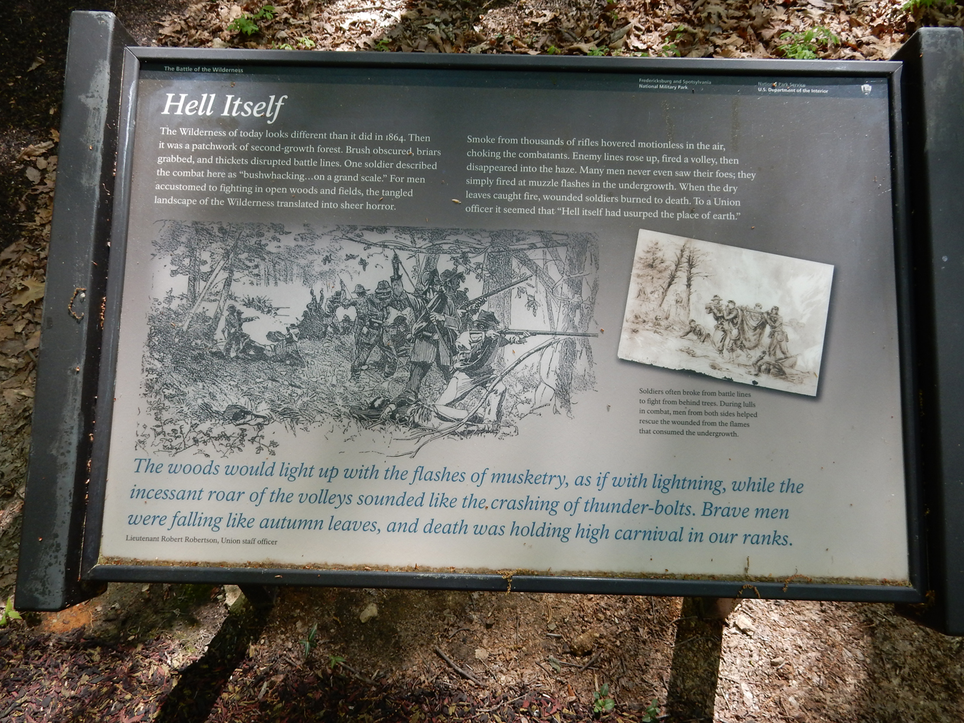 Battle of the Wilderness (May 5-6, 1864) – this was the first clash between Grant and Lee, also the first major battle after Gettysburg. Grant’s objective was to crush the Confederate Army – no matter the cost. The battle took place one year after the Battle of Chancellorsville and only 5 miles further West but in very different terrain – forest of dense thickets and tangled undergrowth.