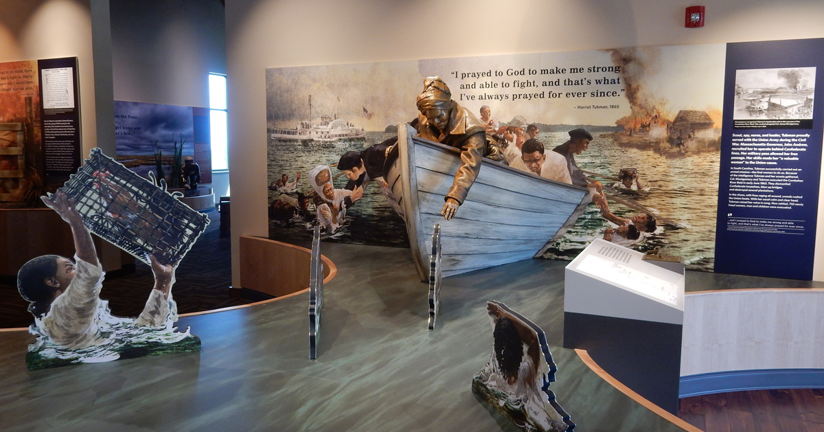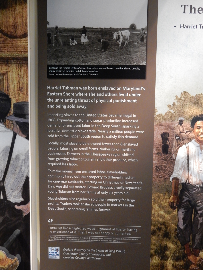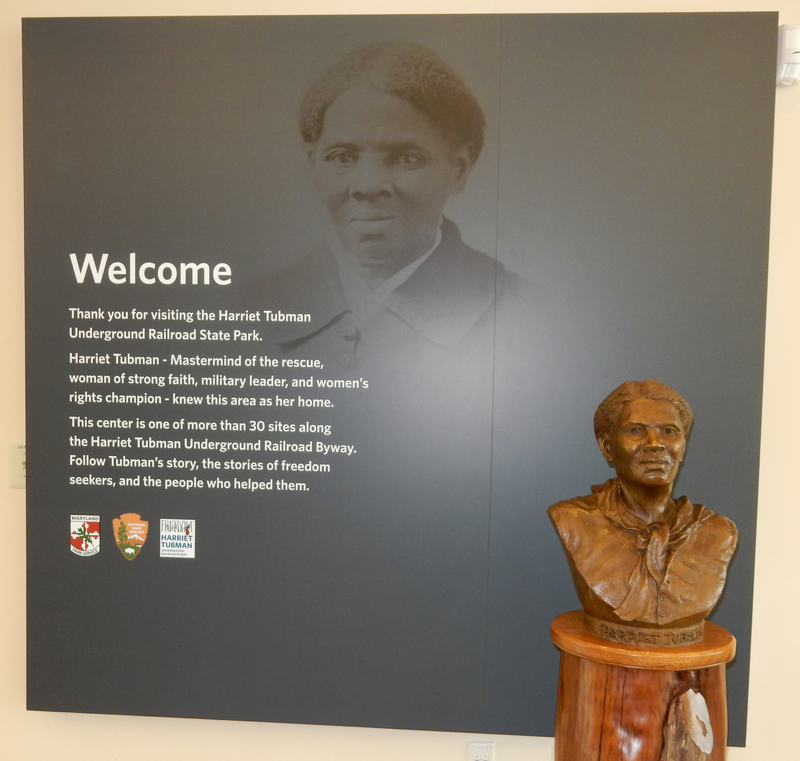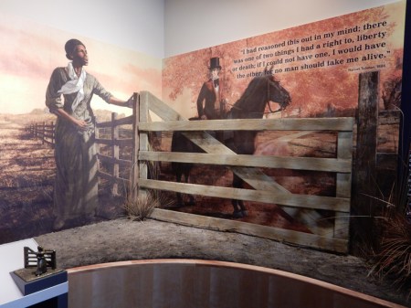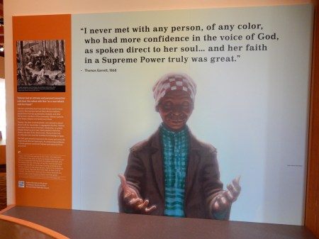 The following displays and signs will tell you about this amazing woman. She emancipated herself in 1849 at the age of 27 by escaping to PA (100 miles away), a non-slave state. She earned the nickname “Moses” for risking her life in guiding more than 70 of her family and friends to freedom. She also served as a nurse and spy for Union forces during the Civil War. Her knowledge of tidal stream areas helped her lead a raid in SC, the first woman to lead a U.S. army military assault. She eventually settled her family in Auburn NY, was active in the women’s suffrage movement, practiced her faith and founded a home for the elderly and disadvantaged.