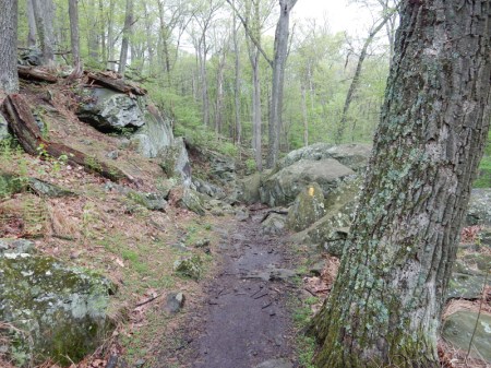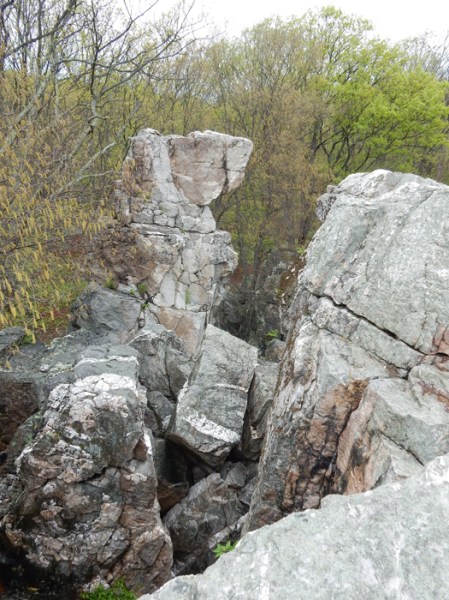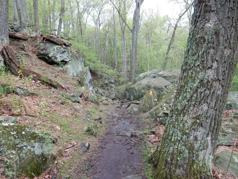 President Franklin D. Roosevelt choose Camp Hi-Catoctin as a retreat he called Shangri-La. President Dwight D. Eisenhower renamed it Camp David after his grandfather and grandson. Camp David is located within Catoctin Mountain Park and is not open to the public. In fact, the Park Central Road is not open when the President or dignitaries are at Camp David. In 1954, the park was divided by MD Rt 77. The north part remains part of the National Park System but the south part is now Cunningham Falls State Park. I put on my Gore-Tex and started on the Chimney Rock Trail near Park Headquarters in a light rain.
