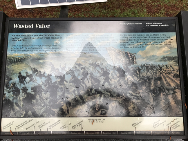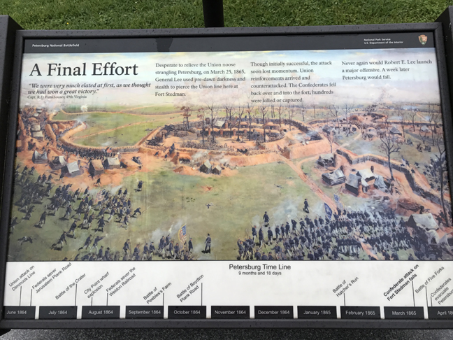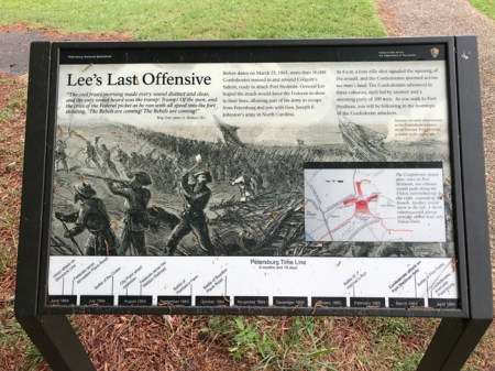 It’s 11pm (I started at 4am) and I am in a Motel 6 – ugh! It doesn’t matter. How can I complain of a little dirt and danger (3 locks on the door) after what I experienced today? I have been to almost all NPS Civil War Sites and each time I come away depressed. However, today was overwhelming. A simple statement is that the North was fighting for unity, national commerce and many for emancipation. The South was fighting for an aristocratic order and freedom as they saw it. “Those who do not under history are destined to repeat it.”
