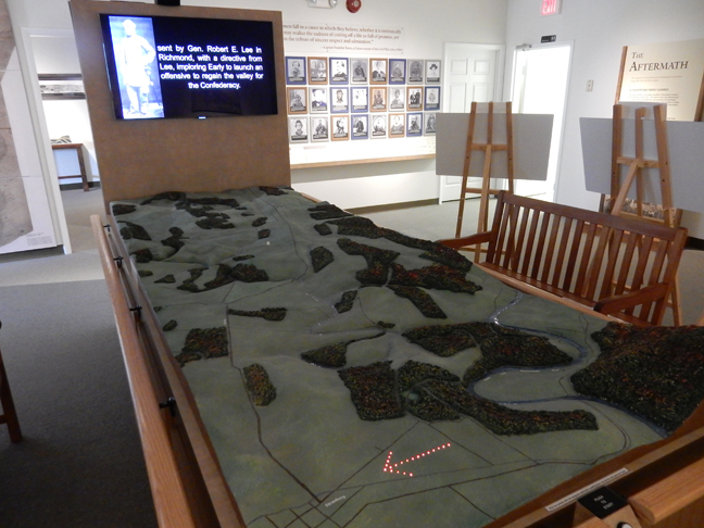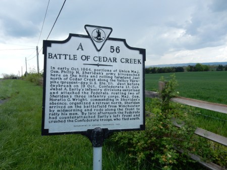 Cedar Creek and Belle Grove National Historical Park – first, the Cedar Creek Civil War Battlefield. In September and October 1864 Gen. Philip Sheridan’s Union Army (32,000) had laid waste to a 75-mile swath of the Shenandoah Valley – the “Breadbasket of the Confederacy.” Lt. Gen Jubal Early was directed by Gen. Robert E. Lee to regain the Shenandoah Valley for the Confederacy. On October 19th Early, who had about 15,000 soldiers, directed a pre-dawn (in dense fog) surprise attack. By about 10am Early had routed the Federals and his soldiers were pillaging their camps – a Southern Victory?