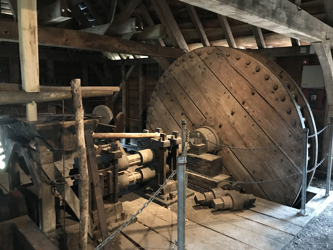 Rolling and Slitting Mill – 1 in 8 iron bars were made into 8 to 10-foot rods of various widths and thicknesses. An outside waterwheel turned a cog wheel inside the mill. In turn, the teeth of the cog wheel meshed with a lantern wheel whose shaft turned rollers and slitters. Some of the rolled pieces were shipped to farmers who could turn them into iron tires for wagon wheels and other items.