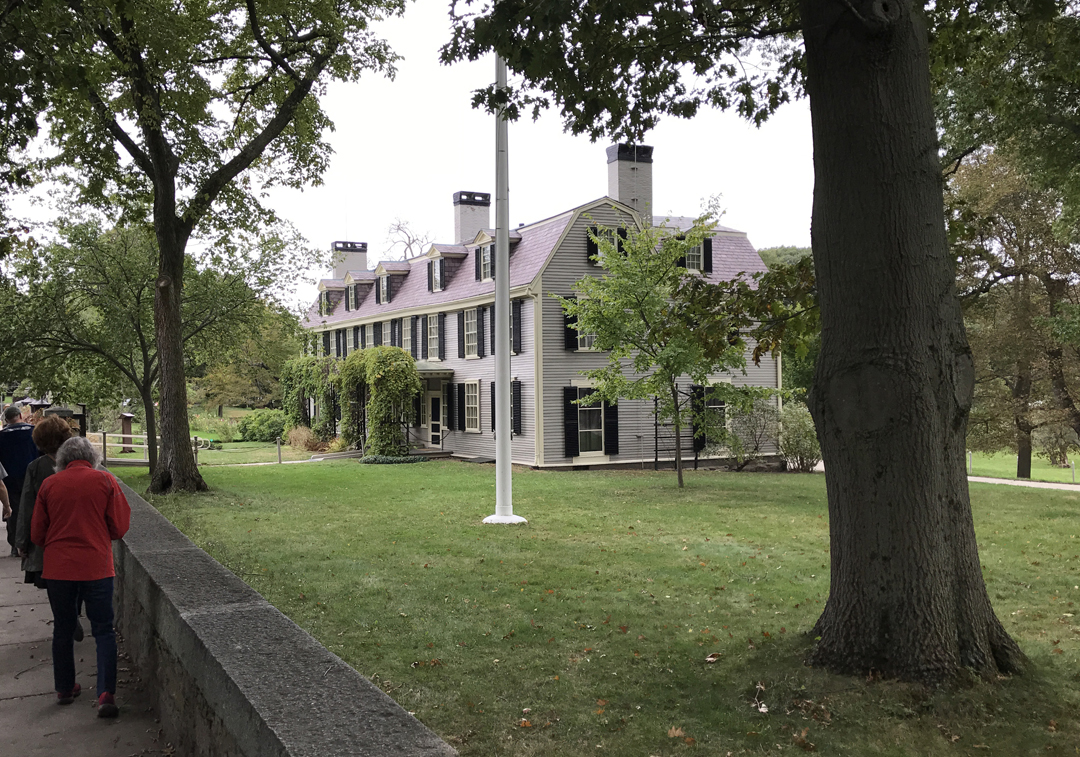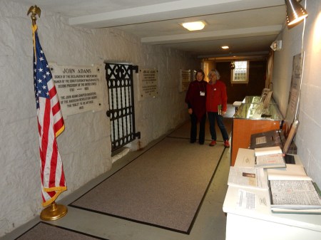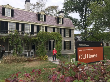 10/16 – Adams National Historical Park is located in Quincy MA just south of Boston. You can get free parking at the downtown garage by presenting your ticket to a ranger at the Visitor Center next door. We arrived at 9:15am and immediately got our ticket (free) for the first tour of the day at 9:15! A guided shuttle trolley transports you to the house where John Adams was born in 1735, for a ranger tour. The house (front part) was built in 1681 and purchased by Deacon John Adams, John’s father, in 1720. The back part was added on later. Upon his father’s death in 1761, John’s brother Peter Boylston Adams inherited the original homestead. The adjacent house (75 feet away), which Deacon John purchased in 1744, was bequeathed to John. The future second president eventually bought his birthplace from his brother in 1774. John and Abigail Adams lived next door and rented out this house during the Revolutionary War. No photos are permitted in any of the houses on the tour due to thefts that were thought to be related to tourists taking pictures to identify items.