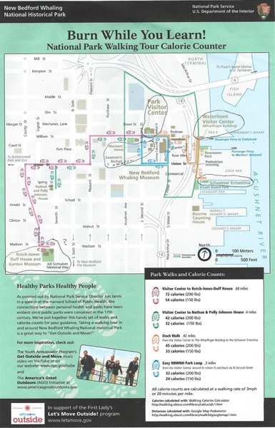 Walked back to the main Visitor Center and had a bowl of Clam Chowder in the Freestones City Grill across the street. From there, it is a 0.68 mile walk to the Rotch-Jones-Duff House and Garden Museum ($5 seniors). I very much like the “Burn While You Learn!” map that follows. I now use it in my presentations promoting physical activity in our National Parks.