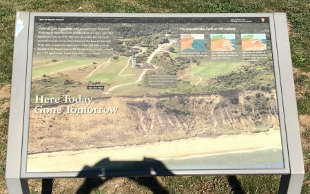 This sign describes how, in 1996, the lighthouse was moved 450 feet back from its previous location because of cliff erosion