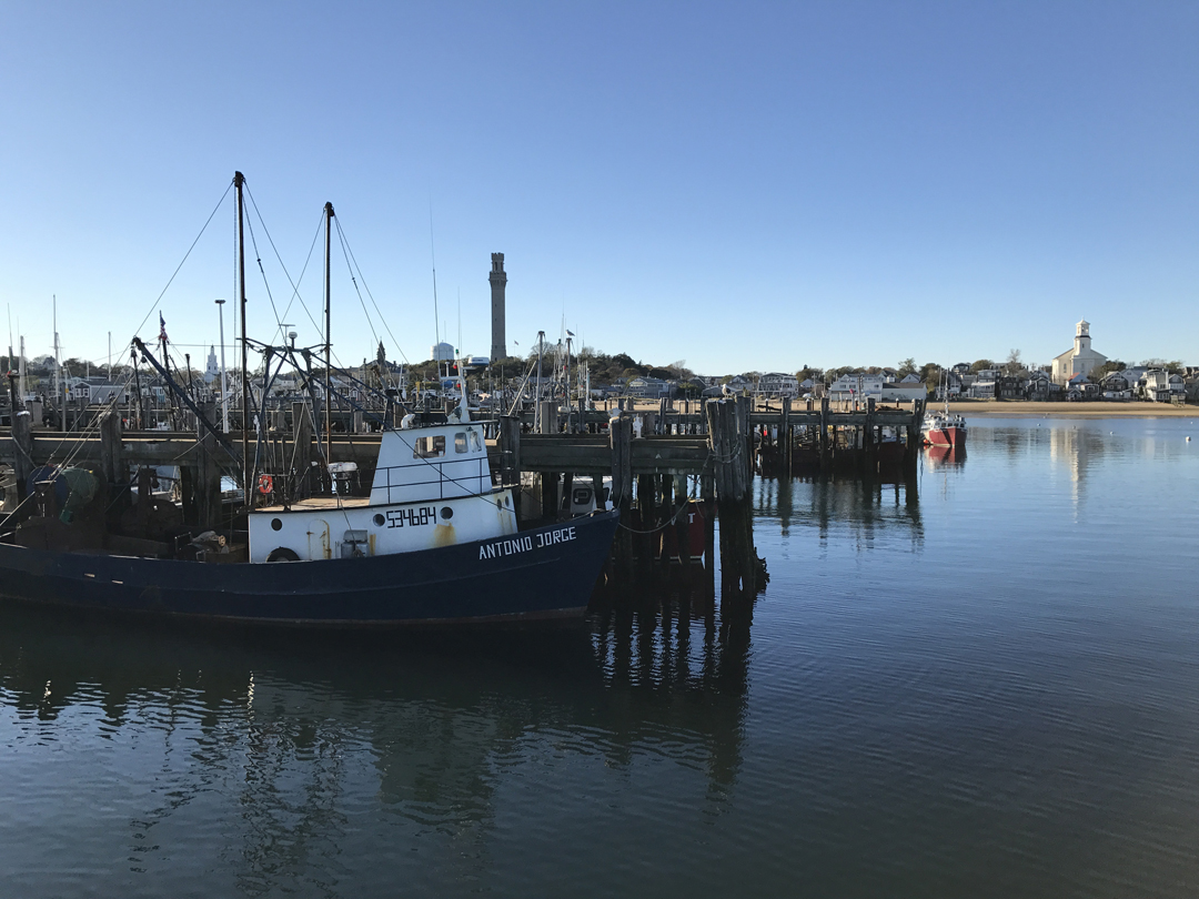 View of the Pilgrim Monument, Public Library, and Provincetown waterfront from the city wharf