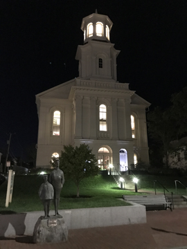 Nighttime view of the Public Library, once the Center Methodist Episcopal Church (1860)