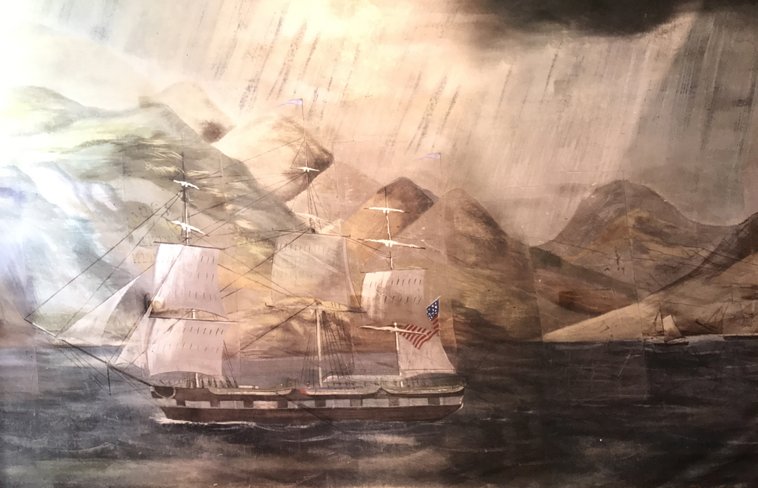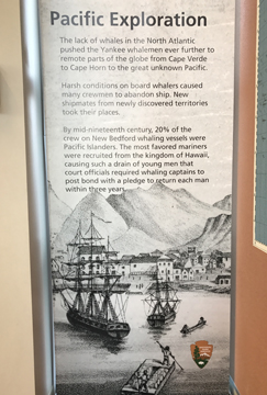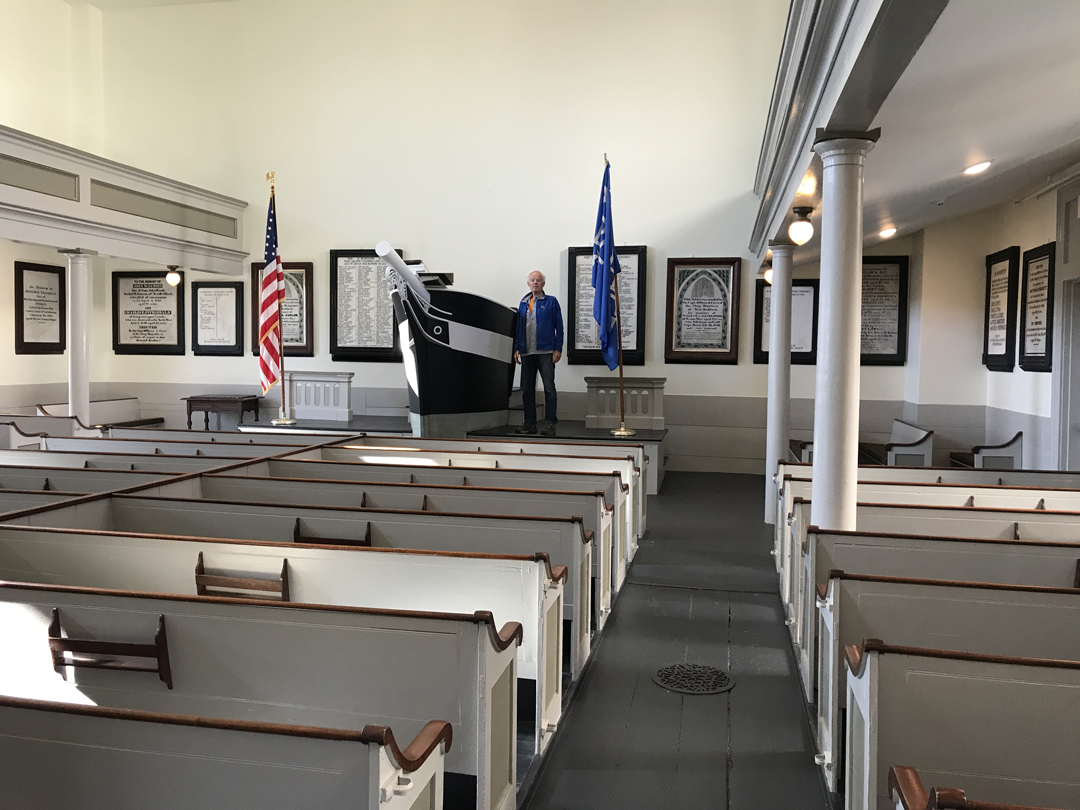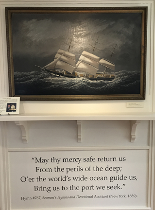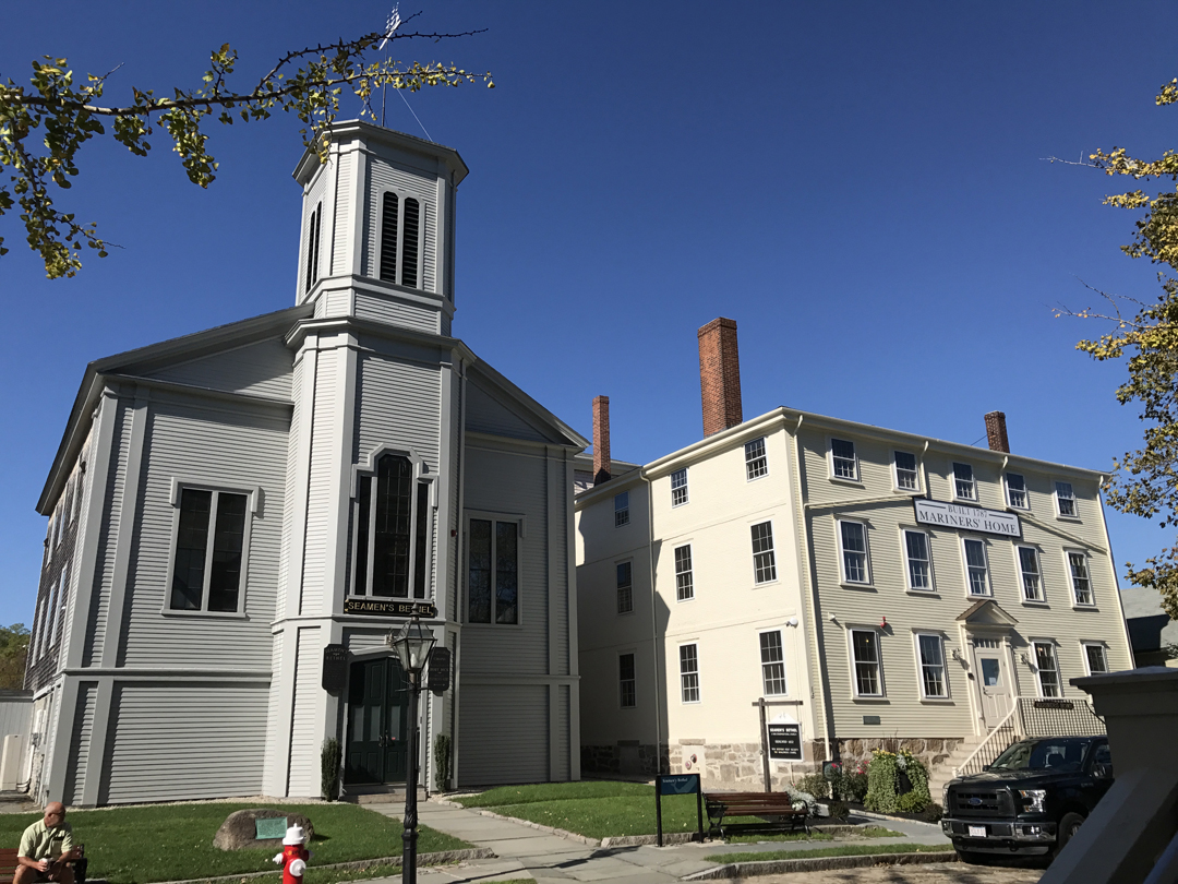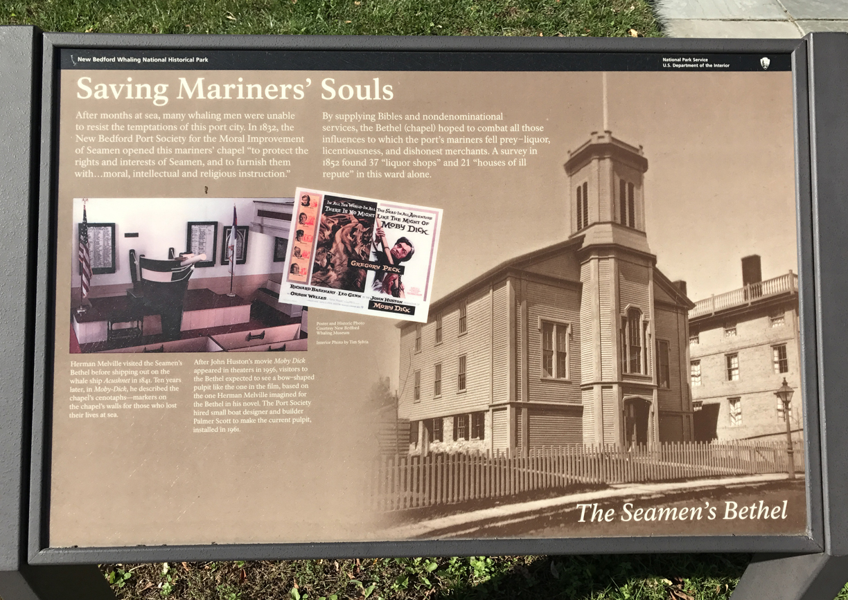 Melville shipped out on the whaling ship Achusnet in 1841 and was an experienced seaman. He also described the marble centotaphs (memorials) to lost seamen in the bethel in his book Moby-Dick (1851). A quote from the book: “In this same New Bedford there stands a Whaleman’s Chapel, and few are the moody fishermen, shortly bound for the Indian Ocean or Pacific, who fail to make a Sunday visit to the spot.”