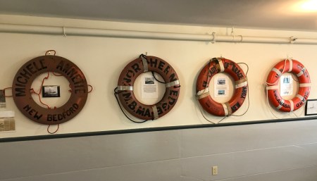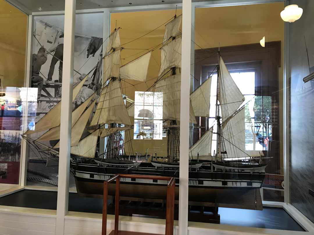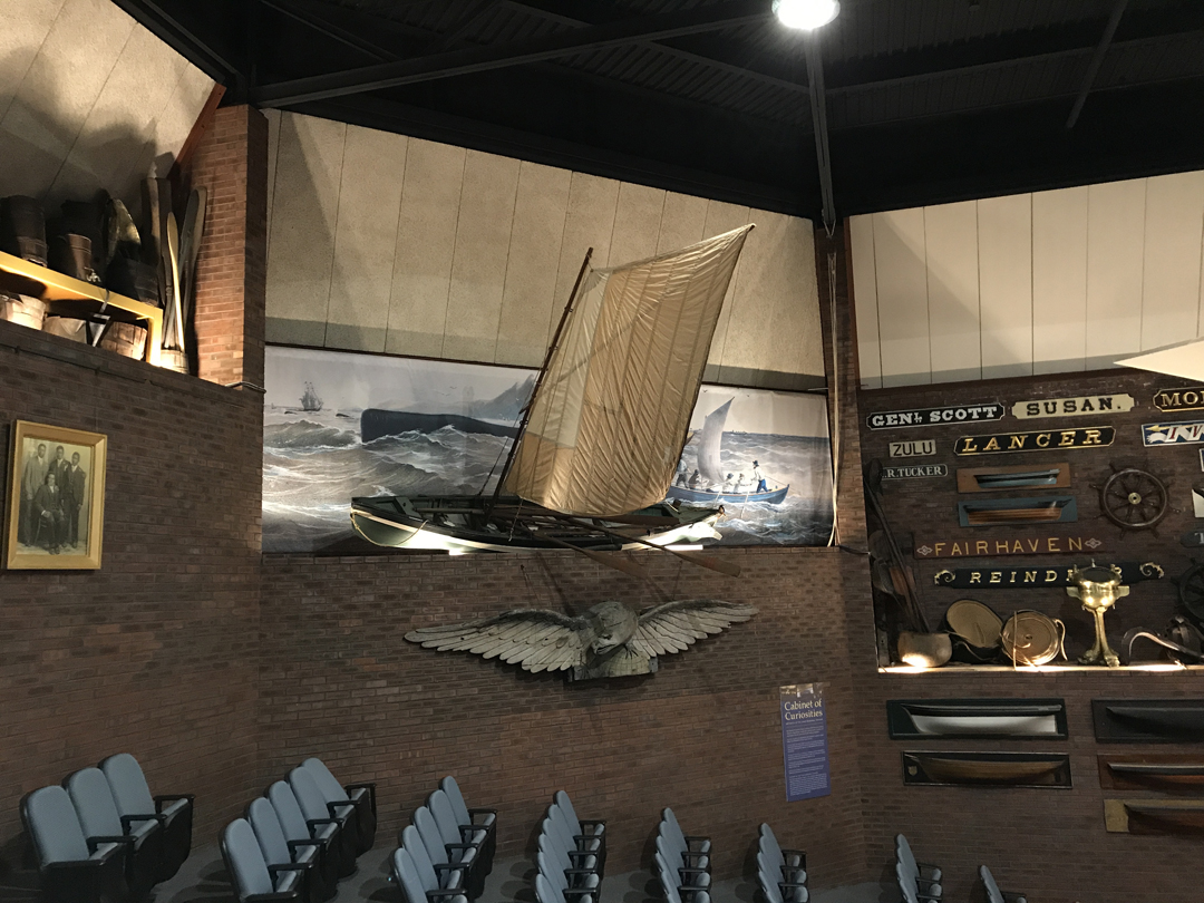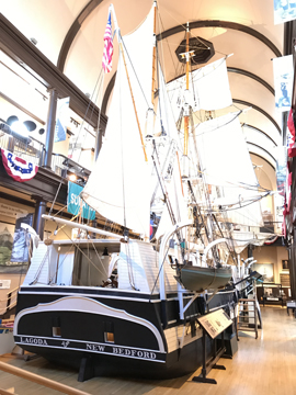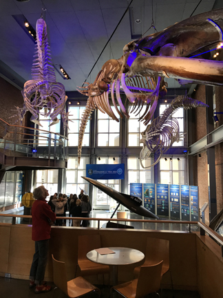 Our next stop was the incredible New Bedford Whaling Museum ($15 seniors). The atrium holds the skeletons of three adult whales and one baby whale. These whales died accidentally or by undetermined circumstances. There is a 37-foot male humpback whale on the right, a 66-foot juvenile Blue whale in the center, and a 49-foot pregnant North Atlantic right whale on the left. The baby skeleton can be seen inside it’s mother.