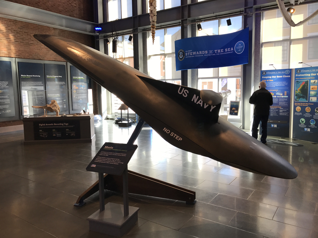There is currently a NAVSEA exhibit in the atrium that is titled Stewards of the Sea: Defending Freedom, Protecting the Environment. It is an interactive exhibit on loan from the U.S. Navy. It is used by marine mammal scientists to capture sounds and other data to better understand whales and their habitat. You can look through a “fish eye” telescope and see what Navy watch looks for when they scan the ocean surface for whales, watch blue whale tagging in action off the coast of Patagonia, and see an enormous, but stealthy, automated underwater glider.