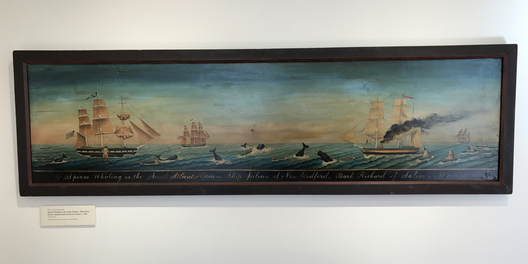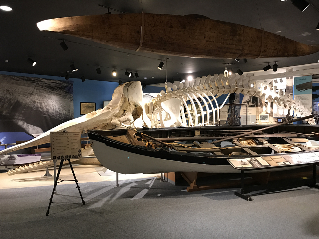 Impressive display of a 48-foot sperm whale next to a whaling boat. A “Nantucket Sleigh Ride” took place after a whale was harpooned and a boat like the one you see was dragged behind until the whale was fatigued and could be killed.