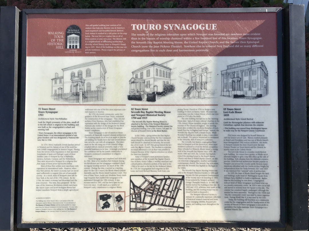 It took about an hour to drive to Newport RI and the Touro Synagogue National Historic Site. Their NP web site stated that the last tour was at 3pm. We arrived just before 2pm and were told that the synagogue was closing. We were not only disappointed that we could not get the tour but also that they would not let us get a quick glimpse inside the synagogue. There were four people there, but unlike other national park units, they were not cooperative.