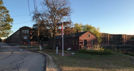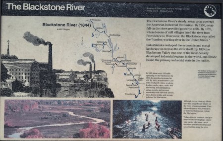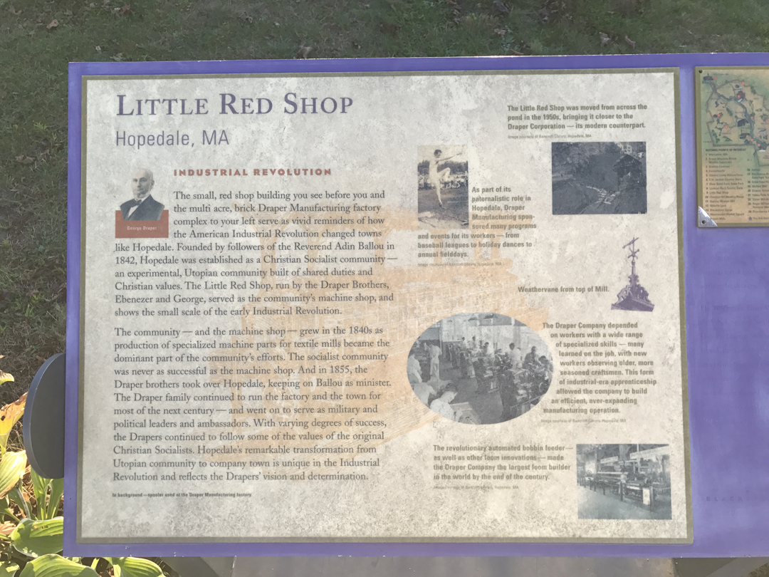 The John H. Chafee Blackstone River Valley National Heritage Corridor runs from the headwaters of the Blackstone River near Worcester MA to Providence and Pawtucket RI and Narragansett Bay. It is billed, like other sites in New England (e.g. Lowell MA, Patterson NJ) as the “Birthplace of the American Industrial Revolution.” The Blackstone National Historical Park (2014) includes many sites within this “corridor.” All the mills and related businesses started by using water power from the Blackstone River. We began our visit in Hopedale MA, the former home of the Draper Corporation. Hopedale itself was established in the 1840s as an Christian experiment in communal living. The Draper business started in 1841 in the Little Red Shop where Ebenezer Draper had a machine shop. He was joined by his brother George in 1853 and together they found numerous ways to mechanize the weaving process. During the 1880s, Draper companies sold more than six million high-speed spindles to textile companies. By the 1890s, the Drapers dominated the loom making business. For over one hundred years the Draper family maintained complete control over the town. During this massive development they worked hard to develop a Utopian community. At its peak, the Draper Corporation employed over 4,000 workers.