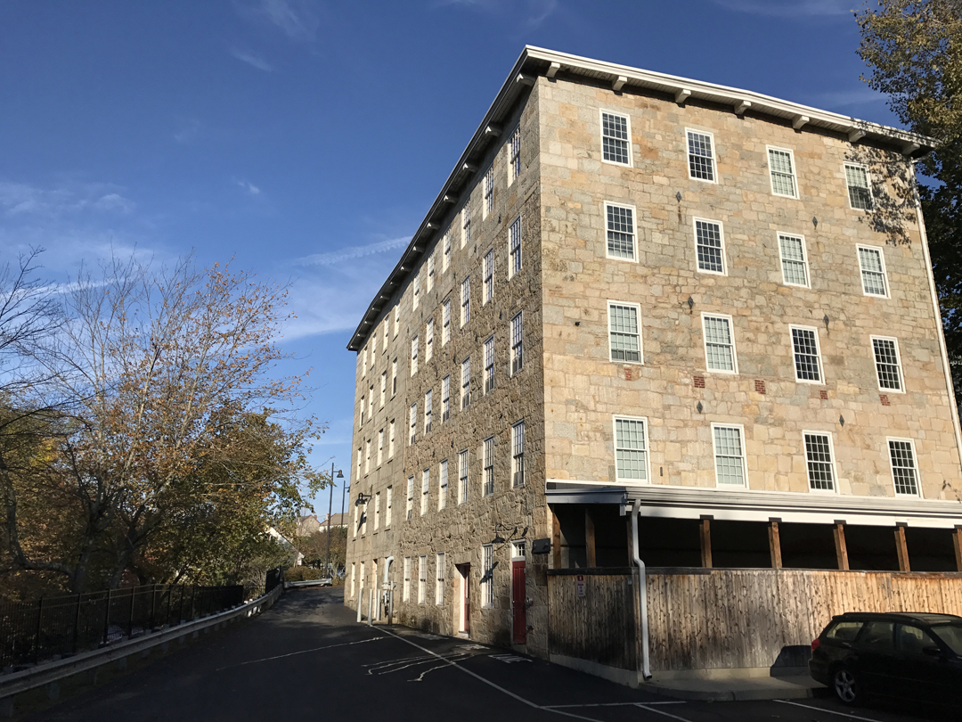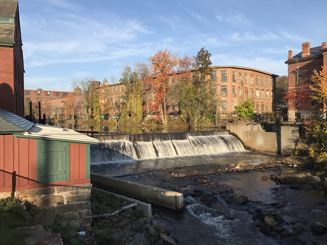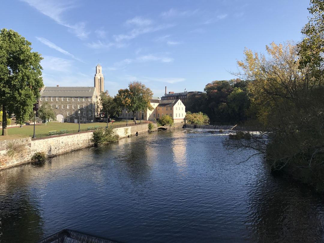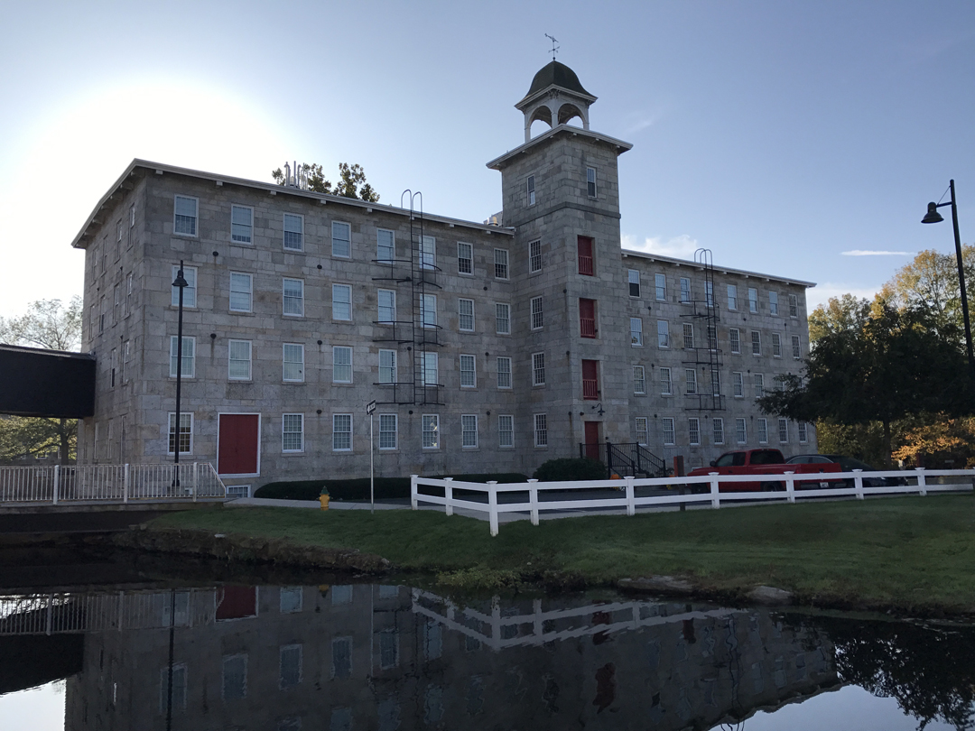 10/19 – we started the day by driving to Whitinsville MA, another mill town along a tributary (Mumford River) of the Blackstone River. Like Hopedale it was a company town controlled by one family, in this case the Whitins. After the Revolutionary War, Col. Paul Whitin came here to work in the iron forge. He married the owner’s (James Fletcher) daughter and formed an alliance establishing the Whitin-Fletcher Cotton Mill in 1815. In 1826, Whitin bought out Fletcher and named the firm Whitin and Sons (he had five). They developed the Whitin Machine Works that would become the world’s largest textile machine shop. This is a picture of the Old Brick Mill cotton and textile machine shop built in 1826.