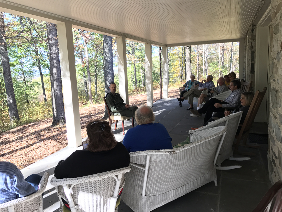 After the Val-Kill tour, we drove back to the FDR Visitor Center and obtained the last two tickets for the ranger tour at the Top Cottage. We boarded a park mini-bus and arrived at the cottage at 1:10. The Top Cottage was built by FDR as a “. . . small place to go to escape the mob.” He helped design it emphasizing it’s need to be wheelchair friendly. It is located one mile from Val-Kill at the top of Dutchess Hill, one of the places FDR would play as a child. Ranger Kevin Oldenburg beginning tour in cottage –