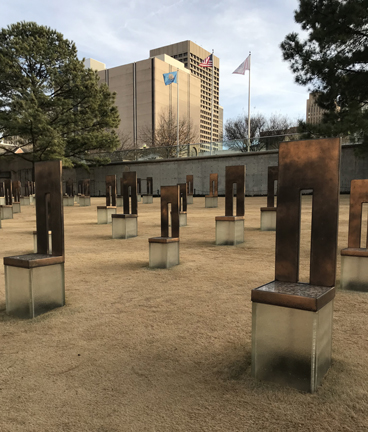 The 168 chairs are within the footprint of the Federal Building. One for each victim, with the small chairs representing the children that were killed.