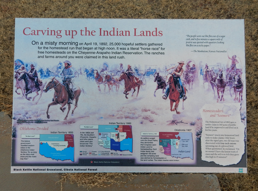 We then did the 1.5mi self-guided Overlook Trail to Chief Black Kettle’s Camp. Black Kettle was a Cheyenne Peace Chief. In 1864, his village in Colorado was attacked while he was flying a white flag of surrender – the Sand Creek Massacre (we will visit that site later in this trip). Black Kettle escaped the massacre. While Black Kettle was still willing to make peace, other groups of Cheyenne, Arapaho, and Sioux raided ranches, settlements, stage stations and transportation routes. As winter approached in 1868, some 6,000 Cheyenne, Arapaho, and Kiowa laid out their winter camps along 15 miles of the Washita River valley. Unfortunately for Black Kettle, he chose to make his camp some distance upstream from the other tribes. On the morning of November 27, 1868, Lt. Col George A. Custer attacked the sleeping encampment. It is estimated that between 40-60 men, women, and children were killed, including Black Kettle and his wife Medicine Woman. Custer had their lodges burned and their winter supply of food and clothing destroyed. In addition, he ordered the killing of their pony and mule herds, about 800 animals. He also took 53 women and children as hostages as he retreated when the other tribes started to approach the scene. Custer’s “success” is thought to have contributed to his poor judgement at “Custer’s Last Stand,” the Battle of the Little Big Horn on June 25-26, 1876.