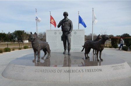 There is a 9-foot bronze sculpture of a Military Working Dog Handler wearing combat gear and holding a dog leash in his left hand and a M4 rifle in his right hand. There are also four sculptures of the more common breeds of military working dogs. In this pic we see the German Shepherd and Labrador Retriever.