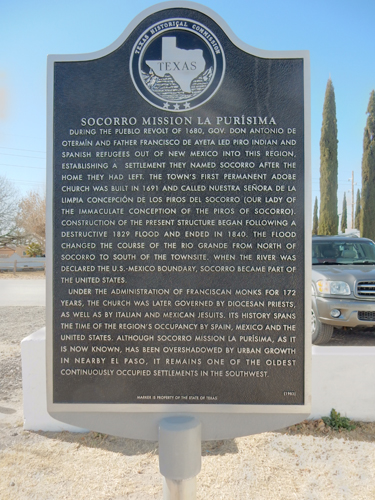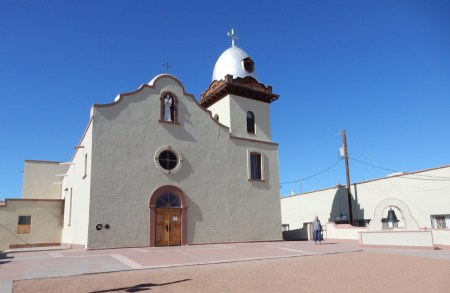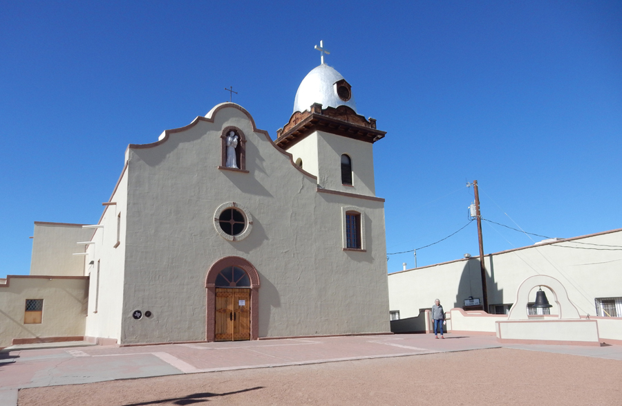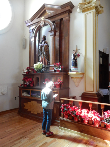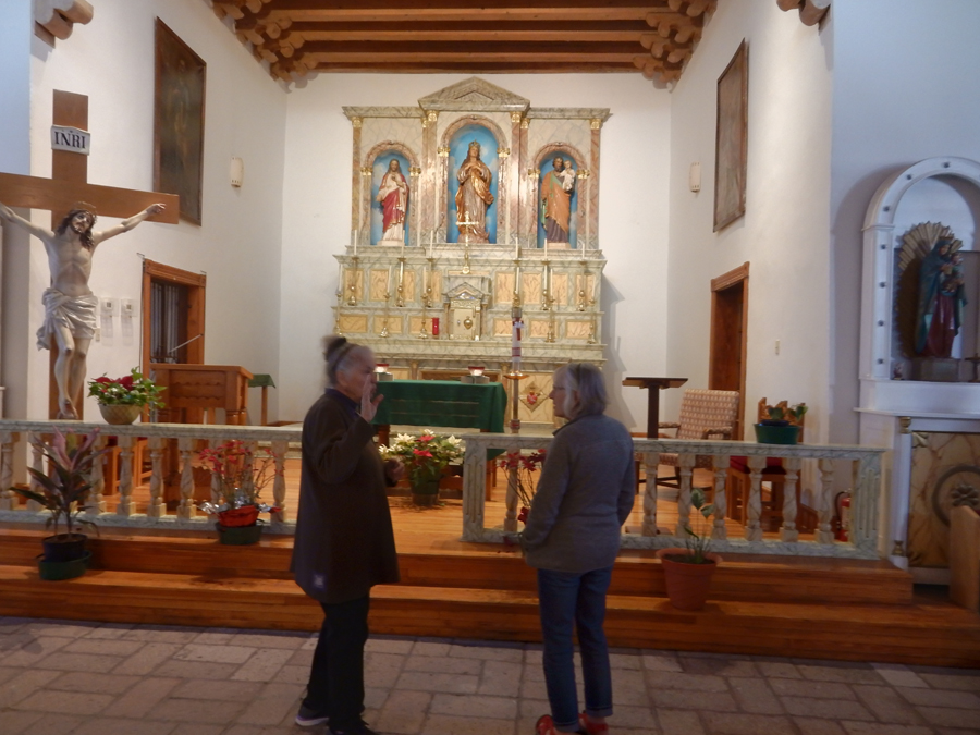 We then walked to La Mision de San Antonio de la Ysleta de Sur established in 1680, the first mission in TX. It was on the El Camino Real, the trading route between the U.S. and Mexico. The current church was built in 1908. The Tiguas Indians continue to worship at the church. Helen is standing by the altar to Our Lady of Mount Carmel, note the Indian representation.