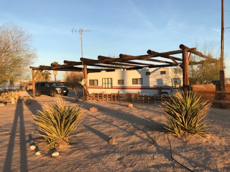 That night had dinner at Peggy Sue’s 50’s Diner in Yermo CA and then stayed in a trailer I had found on Airbnb about a half-hour east of the city. They called it “Glamping,” that is, Glorified Camping! Well, it would have been very nice, except they called us during the day and said there would be no hot water. Not wanting to find something else on short notice (not much out there in the desert), we said that would be OK. The woman said that they had put on the space heater for us because it would be cold that night. When we arrived, we found we could not adjust the space heater – so we ended up turning it off because it was just too hot in there. That night it dropped into the high 30s, we ended up half frozen!