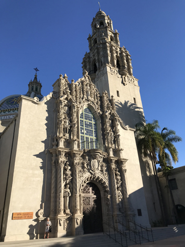 1/31 W – Parked on the west side of Balboa Park about 8am. The park was built for the 1915-16 Panama-California Exposition to commemorate the opening of the Panama Canal. Buildings were built in Spanish-Renaissance style. We walked El Prado Ave past the Museum of Man to the Prado restaurant for coffee.