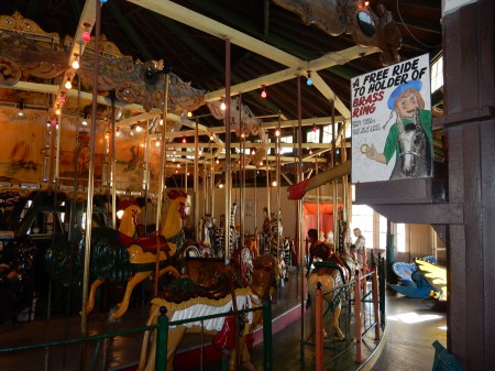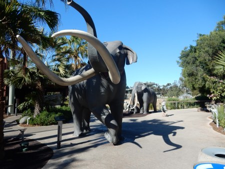 Stopped by the old Carousel on our way to the Zoo. It was built in 1910 in NYC and shipped to CA. After set-up in LA and in Coronado, it made its way to Balboa Park in 1922. It is a menagerie of animals and all but two pairs are original with hand-carved European craftsmanship. Also original are the hand-painted murals surrounding the upper portion of the carousel and the military band music. This carousel is one of the few in the world still offering the brass ring game for everyone taking the 5-minute ride.