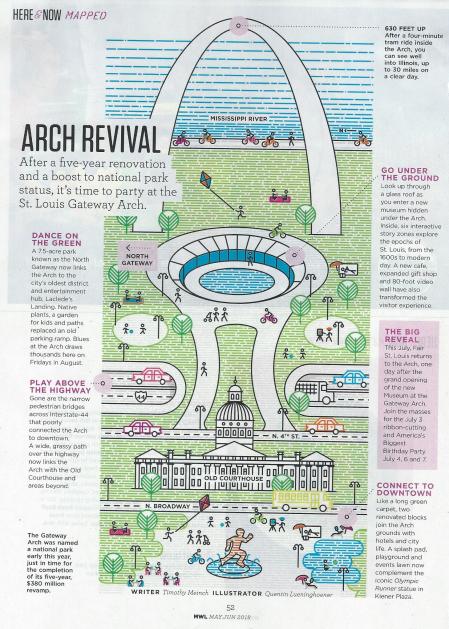 1/15 M – Helen and I left Springfield at 7am and drove into a snow storm in IN and IL. Lots of cars and trucks crashed and off the road in the ditches along I70. As we crossed the Mississippi River, we entered St Louis and could see the newly designated Gateway Arch National Park that Trump approved on 2/22/2018. It was previously called the Jefferson National Expansion Memorial and was a unit in the National Park System. I disagree with the new designation. There is no way that this man-made park is on par with any of the other 59 major National Parks. Every other NP is, among other notable characteristics, a large preserved part of the natural environment. Think Yellowstone, Grand Canyon, Great Smoky Mountains, Yosemite, Acadia, etc., etc., etc. There is no comparison! In my opinion, it should be designated a National Monument or a National Historic Park.