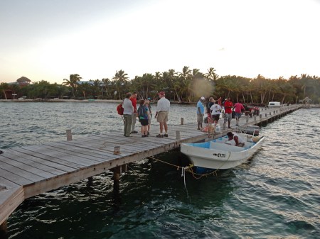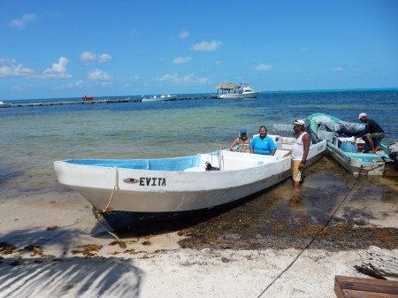 Boarding “Evita” Captain Reves boat that took us to Long Caye. Reves in stern, Nidia (cook) on left, Helen in hat, and LeRoy (worker) in bow. Reves added 4 people to our boat who were workers at another resort on the island. It was a rough ride as we bounced across the open “Blues.”