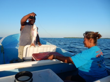 We felt guilty catching many of these beautiful reef fish and Helen insisted that they throw back three large Queen Trigger fish. After about an hour, we were ready to come in. Reves, LeRoy, and Nidia wanted to continue fishing. Being agreeable people, that is what we did and continued fishing for another three hours! Though I must admit that after the first three hours it was quite uncomfortable, we were out four! I caught 9 fish, Helen caught 7 and the five of us combined caught about 50! That evening, we each ate one of the Dogfish and the rest of our fish were given to Reves. He gives them to family and sells them for additional income.