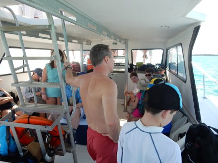 Helen had trouble descending yesterday, so she asked for more weight today. The divers left the boat first and started on what was to be a deep (~132 feet) dive to the stalactites. Shortly afterward, I began to snorkel. When I looked back at the boat twenty minutes later, I was surprised that Helen was back on board. I went back to see what had happened. I found that she had not filled her BC with air before she started to descend (too rapidly). She thought one of the crew had done it like they had the previous day. As she quickly descended (recall she had also asked for more weight!), she could not clear her ears and started to go into panic mode. Maurio noticed what was happening and brought her back up to the surface. She then joined us on our snorkel. On the way back to the dock she mentioned that her ear was really bothering her.