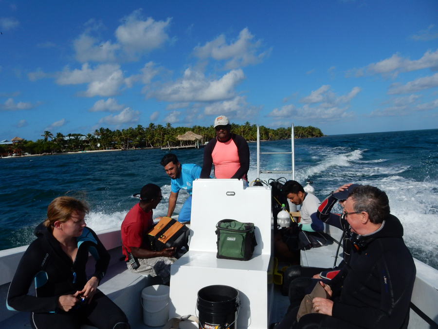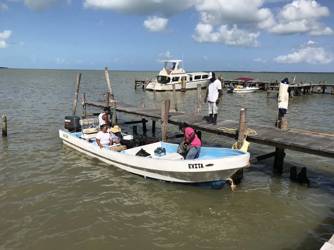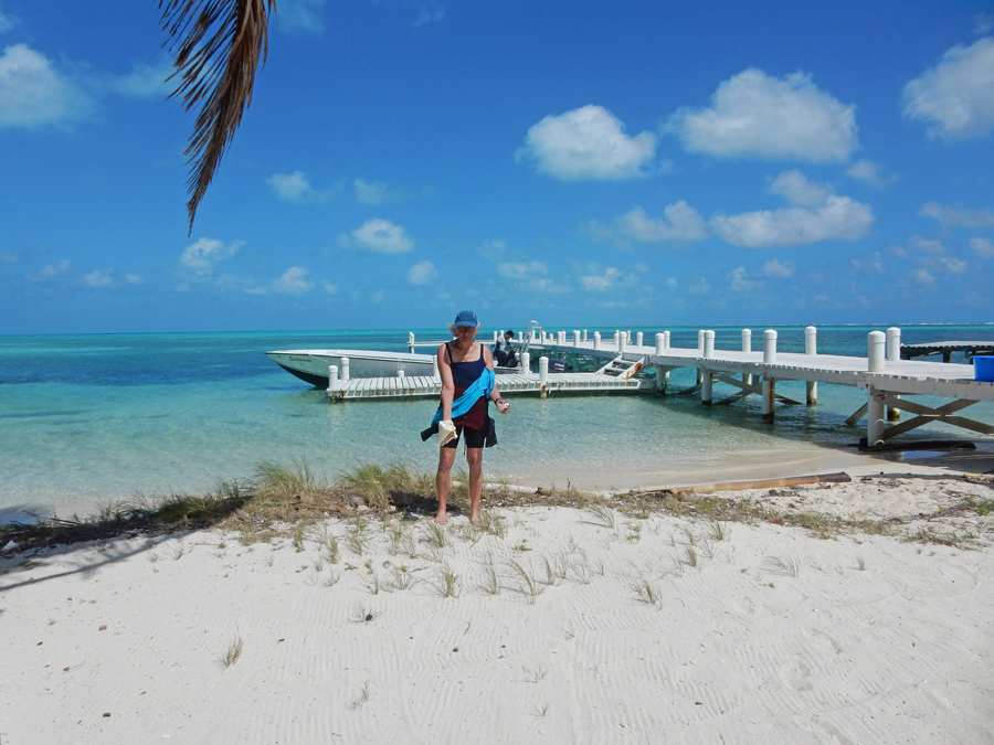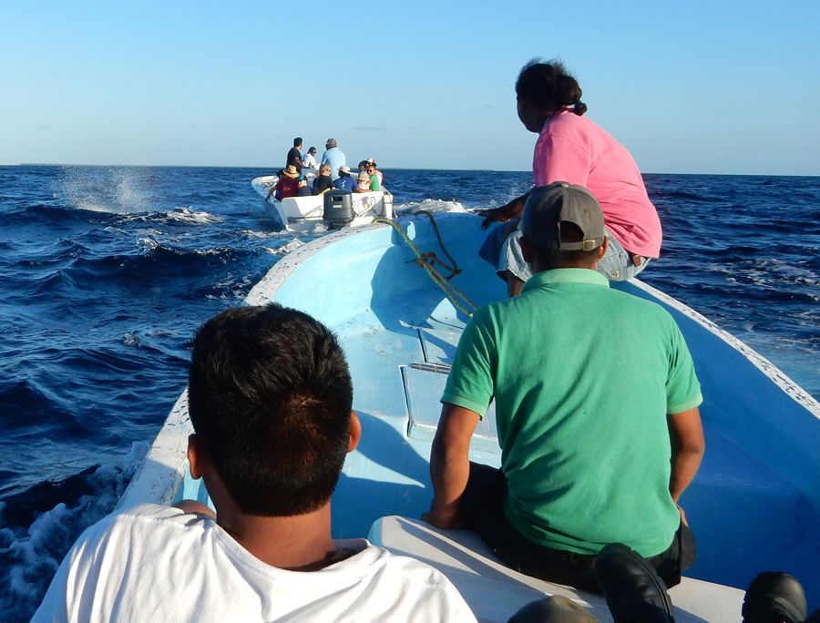 Boarding “Evita” Captain Reves boat that took us to Long Caye. Reves in stern, Nidia (cook) on left, Helen in hat, and LeRoy (worker) in bow. Reves added 4 people to our boat who were workers at another resort on the island. It was a rough ride as we bounced across the open “Blues.”