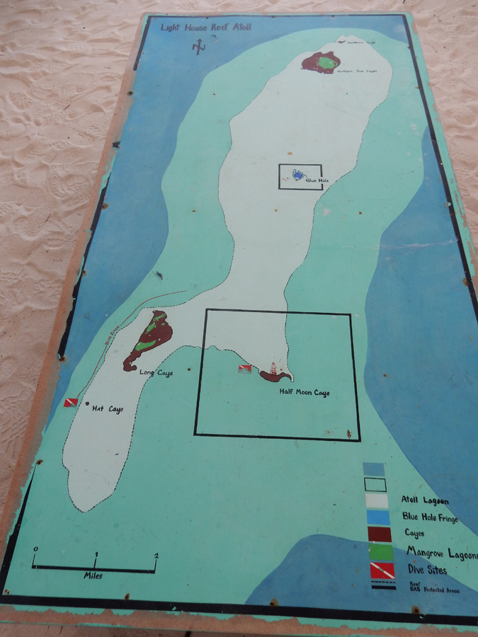 Our Island, Long Caye, is on Lighthouse Reef Atoll, which is on the most Eastern (outer) section of the Belize Reef System. Note on the map the nearby location of Half Moon Caye and the “Blue Hole”