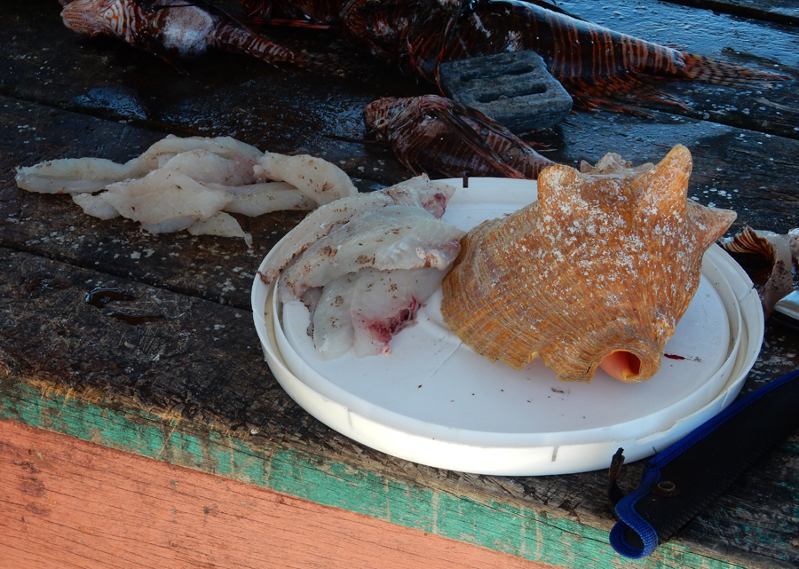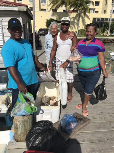 When we returned to our dock on Long Caye, we found some local fishermen cleaning their fish and conch
