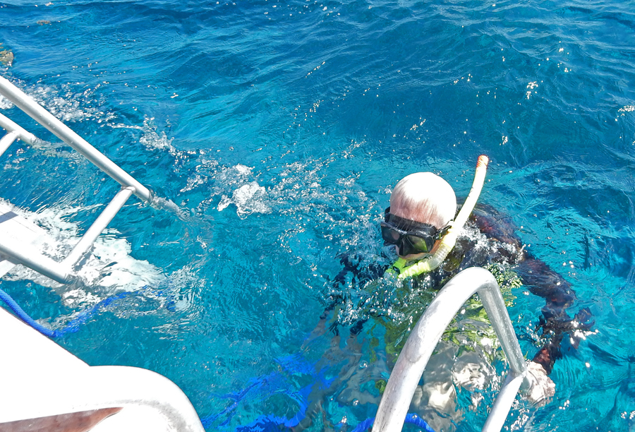 Helen had trouble descending yesterday, so she asked for more weight today. The divers left the boat first and started on what was to be a deep (~132 feet) dive to the stalactites. Shortly afterward, I began to snorkel. When I looked back at the boat twenty minutes later, I was surprised that Helen was back on board. I went back to see what had happened. I found that she had not filled her BC with air before she started to descend (too rapidly). She thought one of the crew had done it like they had the previous day. As she quickly descended (recall she had also asked for more weight!), she could not clear her ears and started to go into panic mode. Maurio noticed what was happening and brought her back up to the surface. She then joined us on our snorkel. On the way back to the dock she mentioned that her ear was really bothering her.