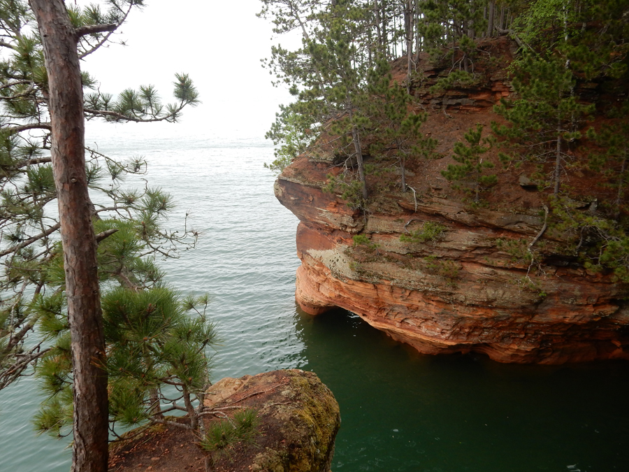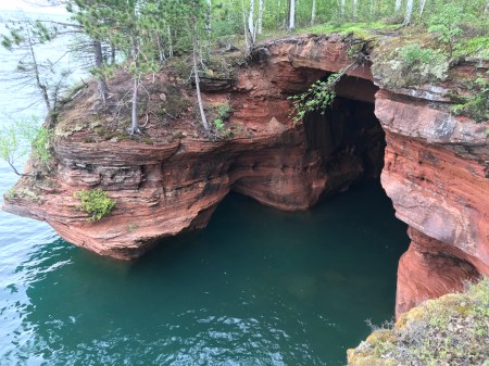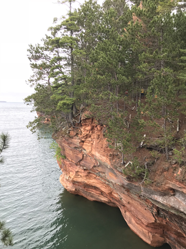 The steep cliff walls of sandstone bedrock can rise over 50 feet above Lake Superior