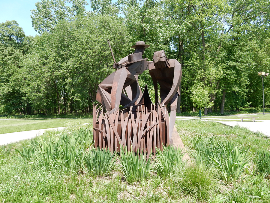 Impressive sculpture representing Fr. Marquette and Joliet passing through here on their discovery (1673) of this Native American connection between the Great Lakes and the Mississippi River System