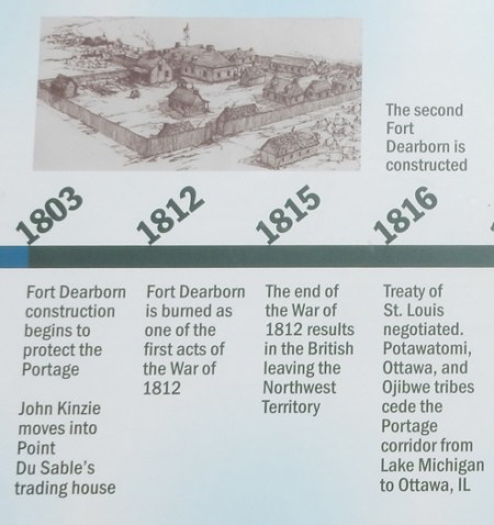 Fort Dearborn was built in 1803 on the Chicago River to protect the “Chicago Portage.” It was destroyed during the War of 1812.