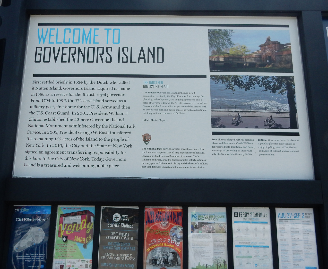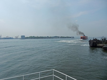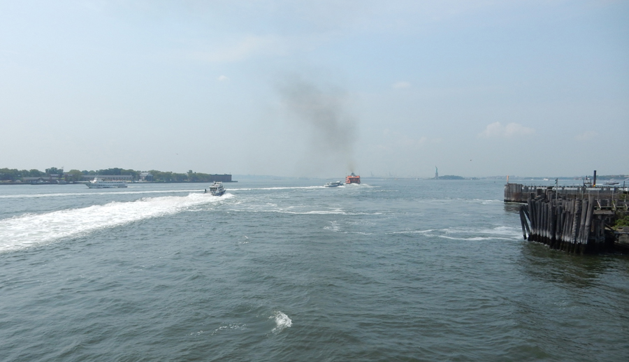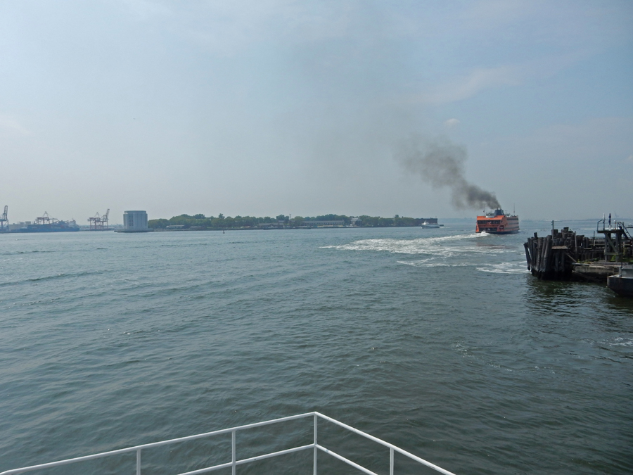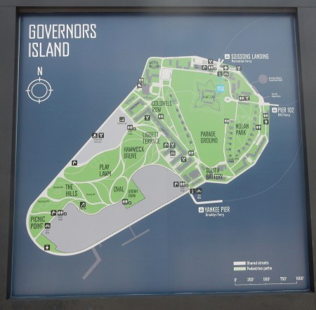We had to hustle to the tip of Manhattan to catch the noon ferry to Governors Island National Monument. It can be seen in the distance. The orange ferry is on its’ way to Staten Island.