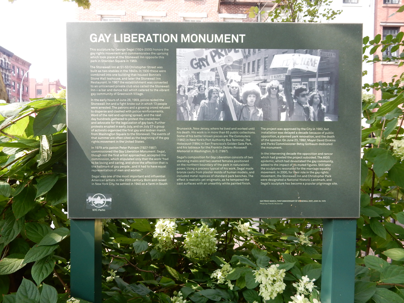 The monument commemorates the Gay Uprising of June 28, 1969 at the Stonewall Inn and in Christopher Park across the street. In the 1960’s, NYC laws, rules, and policies were anti-homosexual. A police raid on the Stonewall Inn precipitated a “riot” where people fought back. It led to several nights of demonstrations in Christopher Park and was a pivotal point for social change across America. Each year on this date there is a Christopher Street Gay Liberation March that begins in Christopher Park and ends in Central Park.